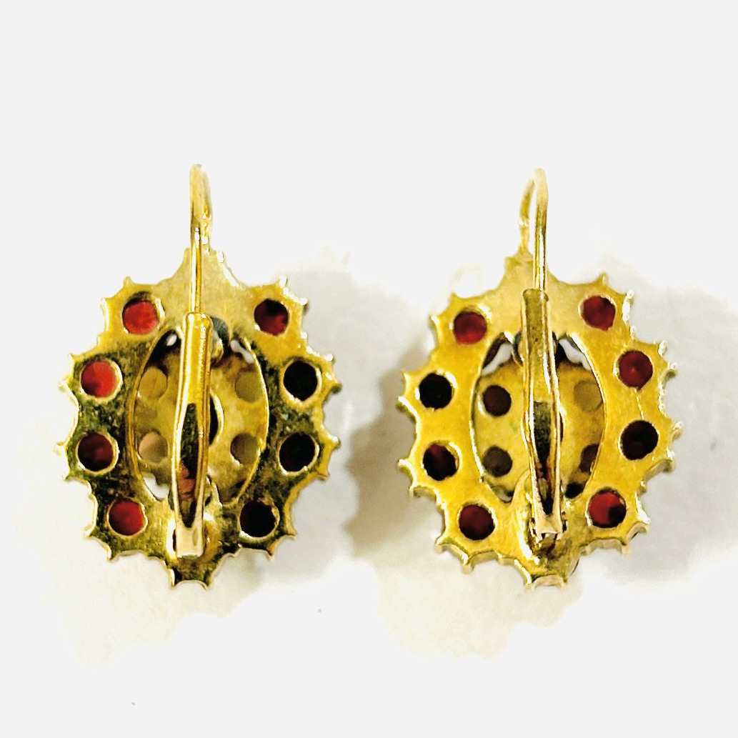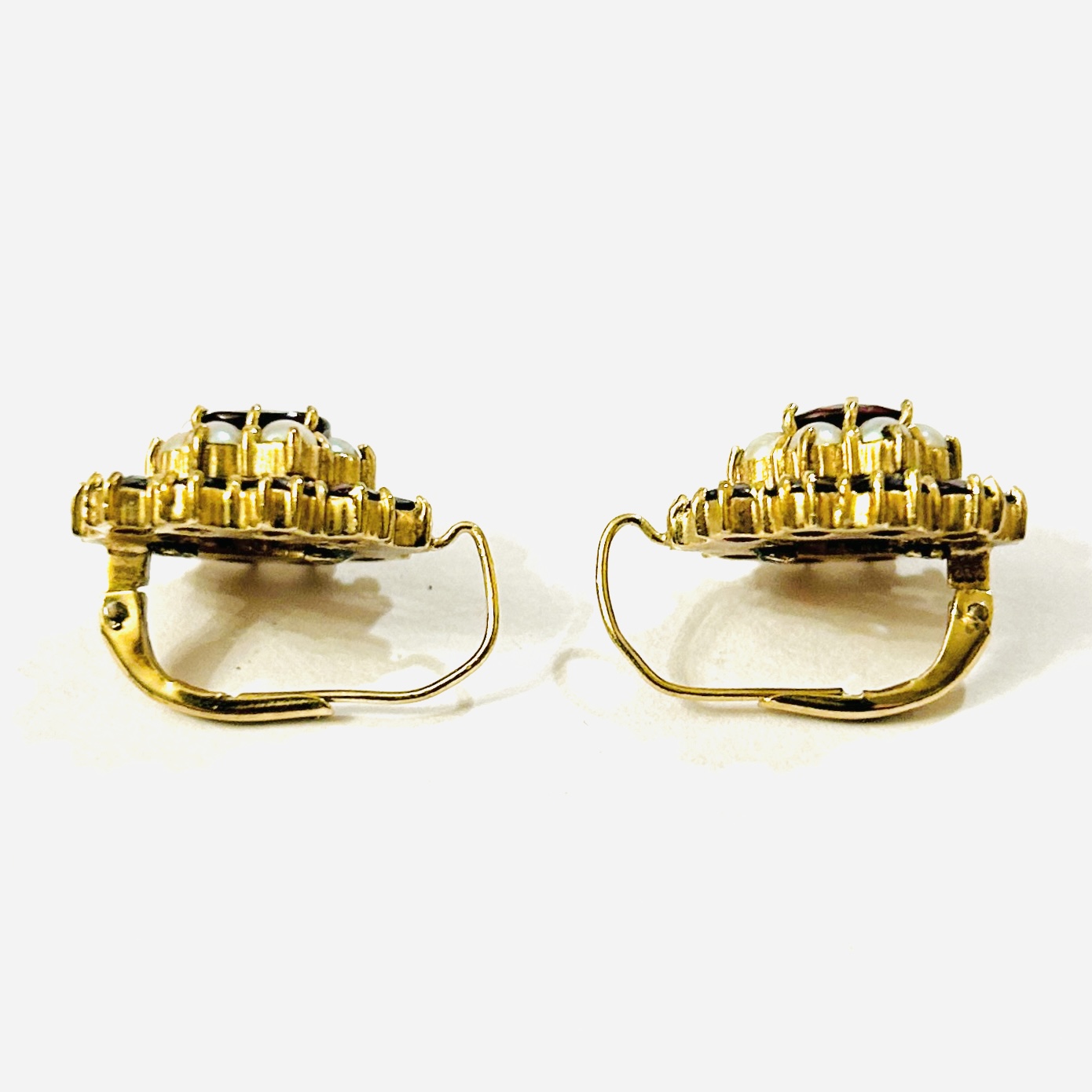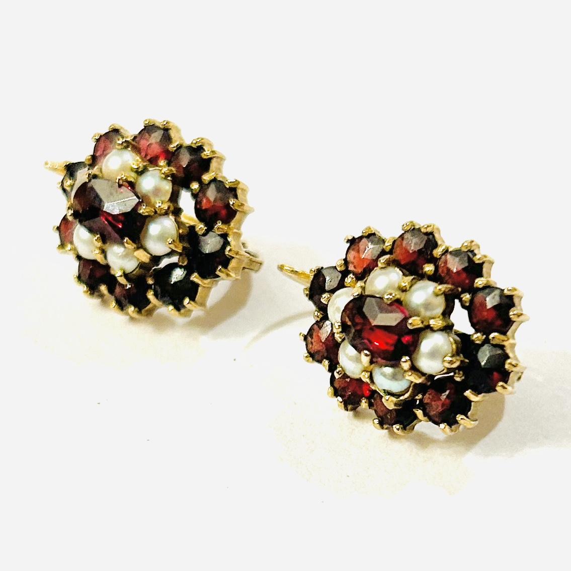 Honosné náušnice s hlavicí připomínající oválný květ, ve středu a při okraji osazeno přírodními granáty kulatého hvězdicového brusu, kontrastní kombinace s přírodními bílo-šedými perlami (půlperly), fasováno krapnami. Kvalitní německá zlatnická práce z 50. let 20. století.