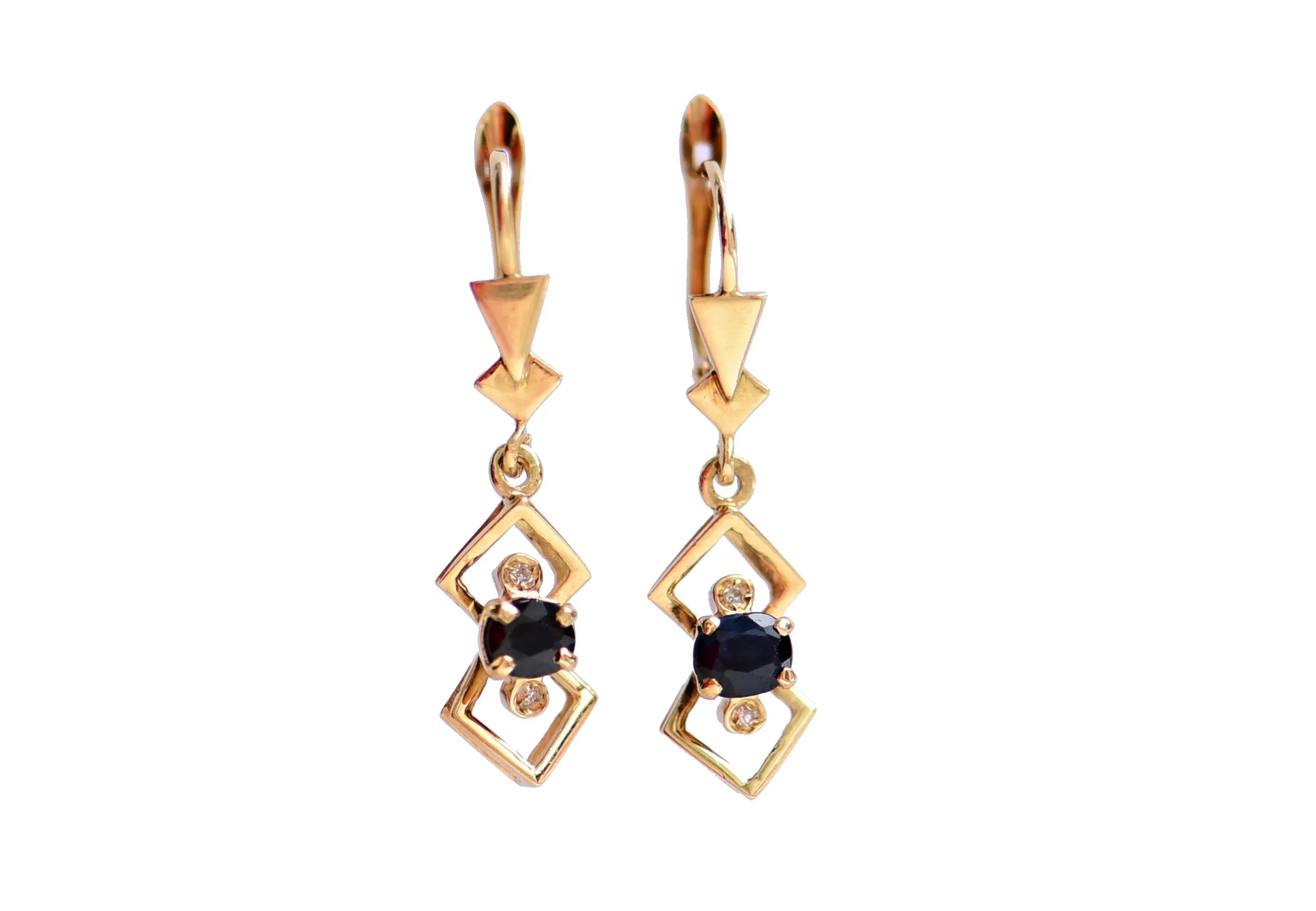 Žluté zlato 18 karátové, přírodní broušené diamanty. Ryzost Au 750/1000, celková hmotnost 8,70 g. Dva přírodní diamanty moderního briliantového brusu o váze 0,30 ct, barva G, čistota Si1. Zlaté 18 karátové náušnice inspirované stylem biedermeier z poloviny 19. století. Zdobené květy s gravírovaným ornamentem, obloučky ze stáčeného zlatého drátku, uprostřed ve čtvercové korunce osázené přírodními diamanty moderního briliantového brusu. Značeno: československý punc hlava kohouta s číslem 3, nezřetelná mistrovská značka. Evropa, 60. léta minulého století. Výška 20 mm, šířka 12 mm.