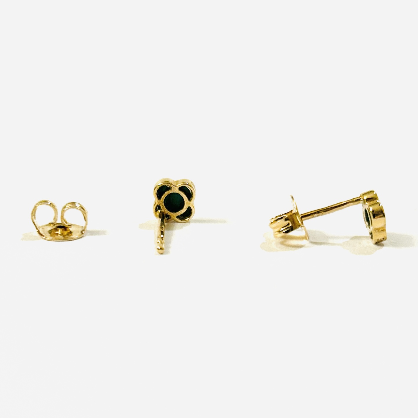 Decentní náušnice s hlavicí v podobě čtyřlístku, která je inspirovaná designem slavného klenotnického výrobce Van Cleef, osazeno přírodními malachity tvarovaného plochého brusu. Patrně tuzemská zlatnická práce z 10. let 21. století.