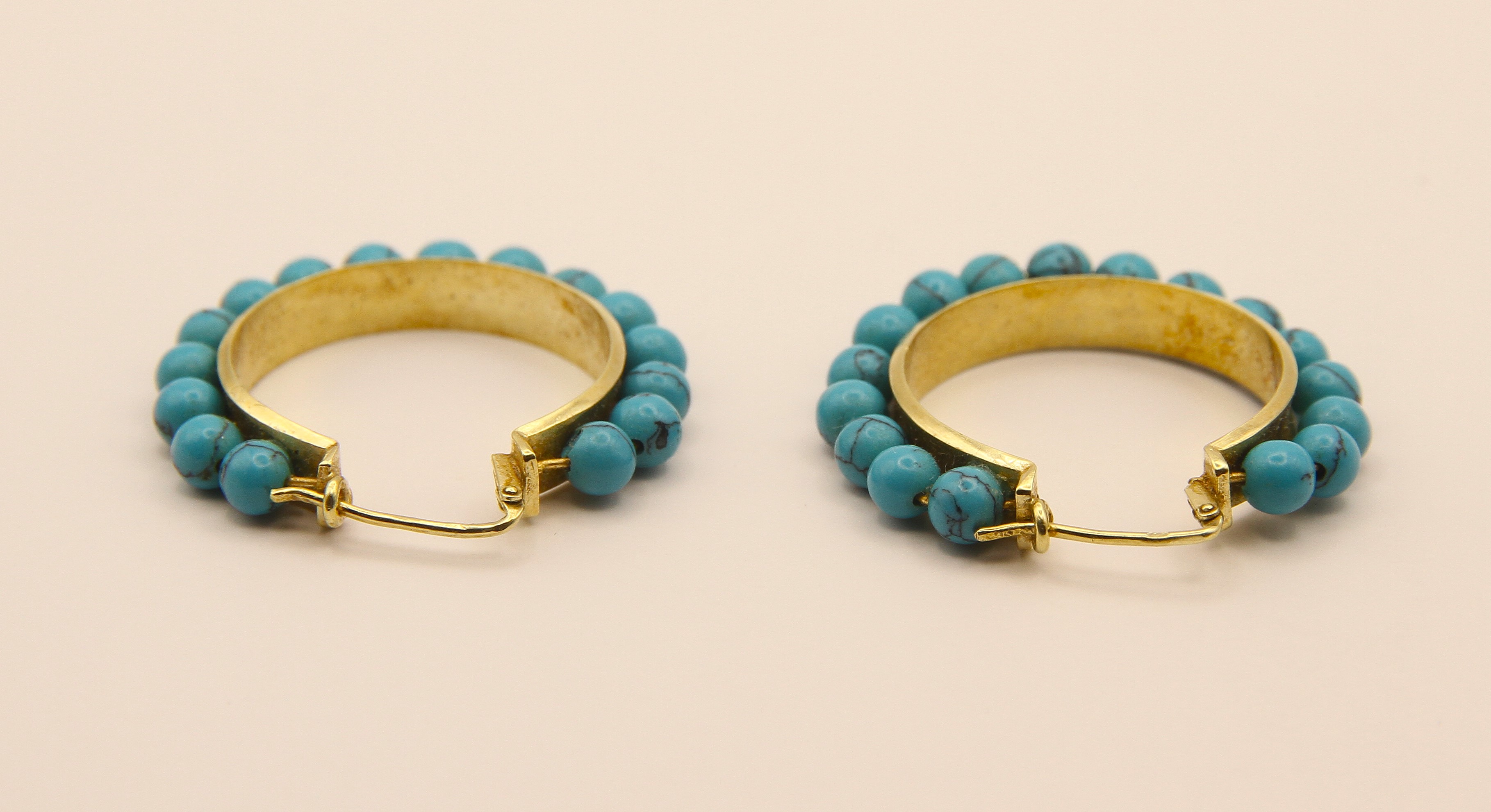 Originální zakázkové náušnice dle návrhu nositelky vyrobené ze zlata a tyrkysových korálků, naprosto individuální osobitý šperk existující ppouze v tomto jednom exempláři. Au btto 10,34g/585/1000, platný punc