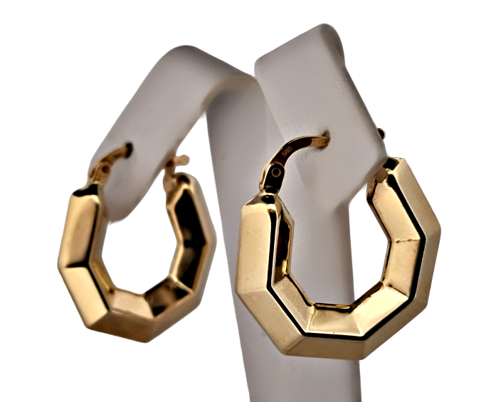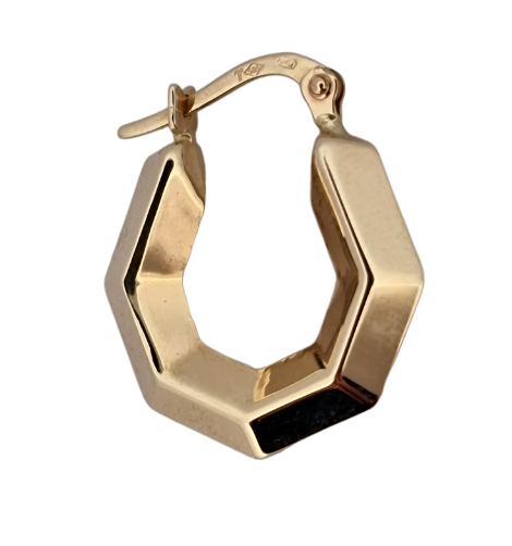 Popis: Zlaté náušnice masivního vzhledu, ve tvaru sekaného kruhu. Zapínání na francouzský zámek.