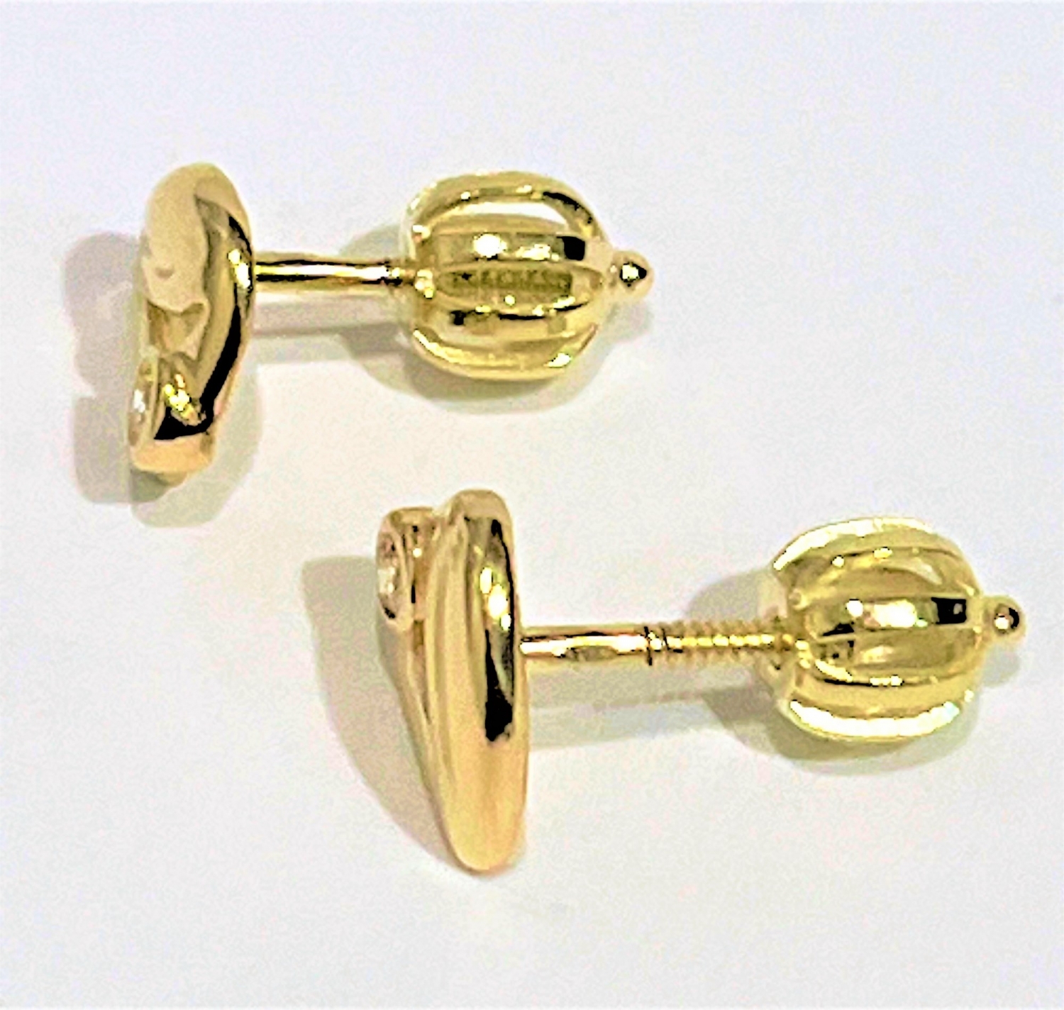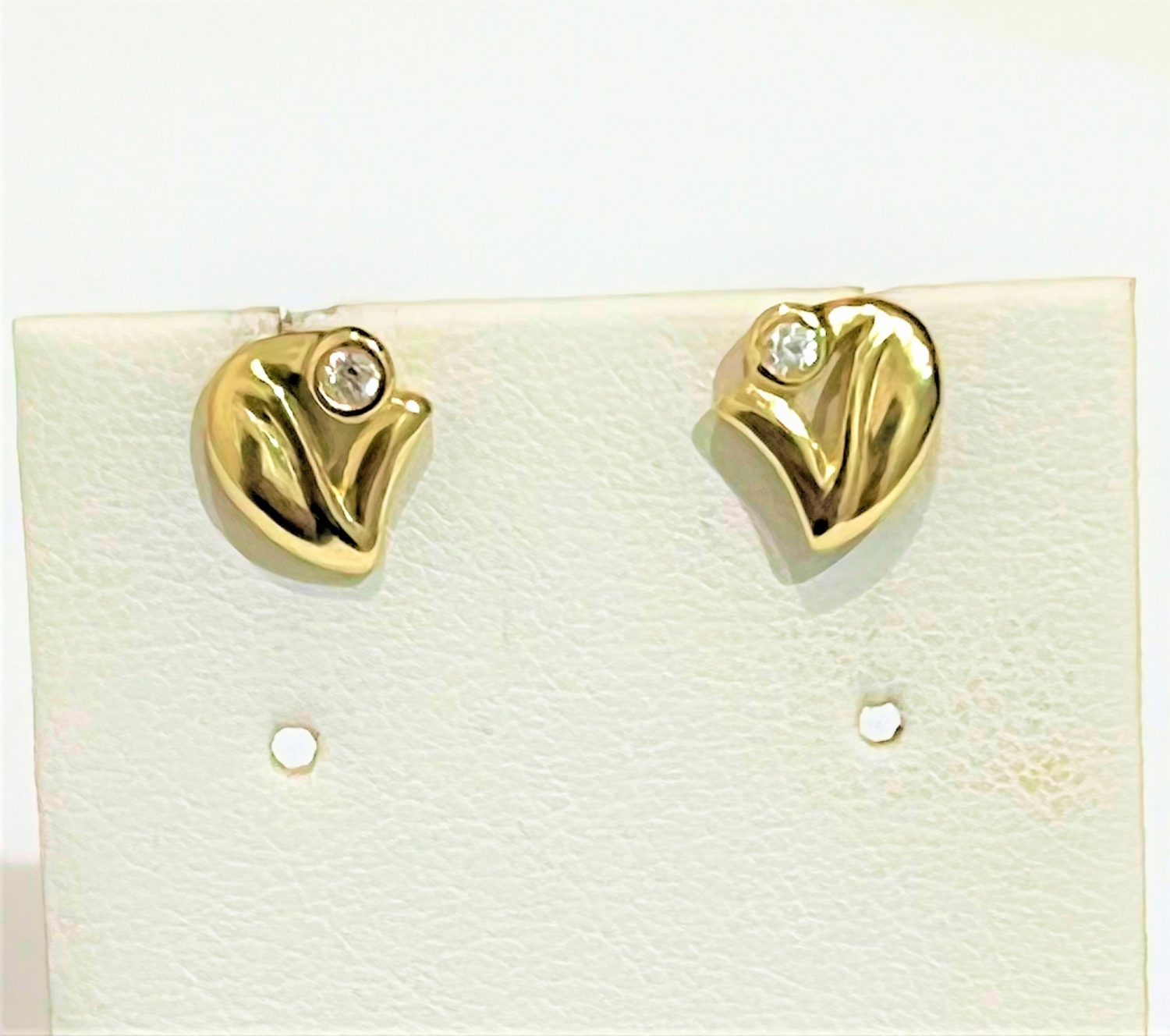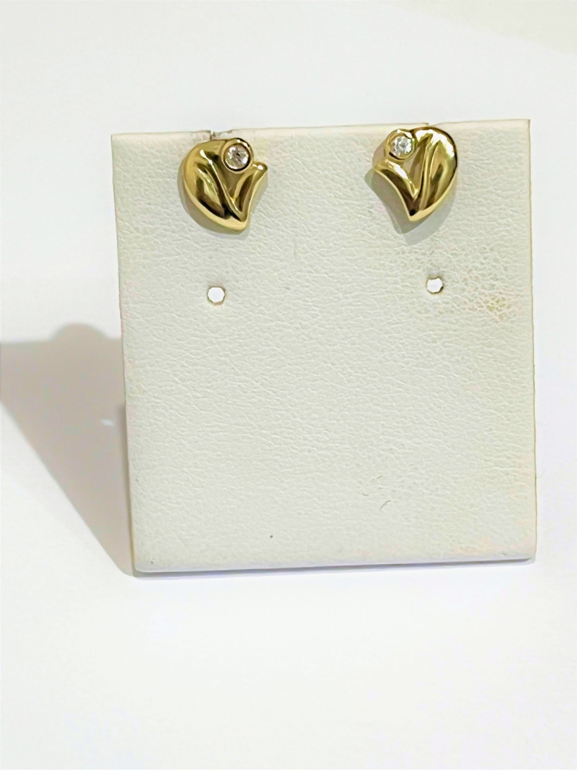 Zlaté náušnice ze žlutého 14 karátového zlata – AU 585/000 doplněné bílým kamínkem, váha náušnic 1,61 gramů brutto. Zapínání na klasický šroubek.
