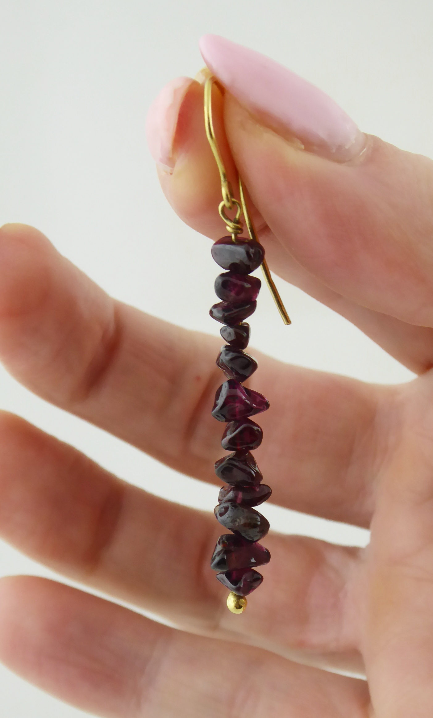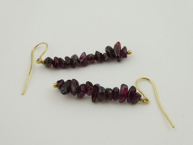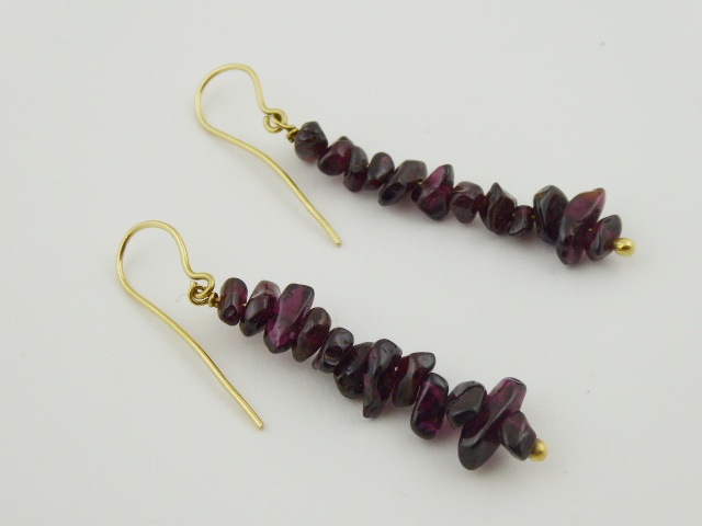 Žluté osmnáctikarátové zlato, přírodní leštěné almandiny. Ryzost Au 750/1000, celková hmotnost 6,85 g. Ověskové náušnice z osmnáctikarátového zlata zdobené po většinu své délky 24 přírodními leštěnými almandiny. Zapínání na závěs. Značeno: nově označeno platný český punc kohout. Evropa, třetí třetina minulého století. Délka 56 mm.