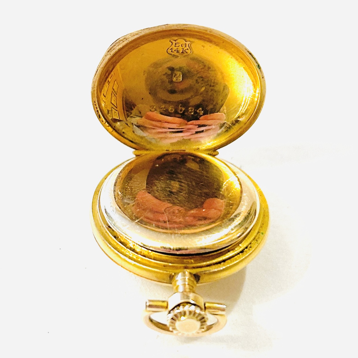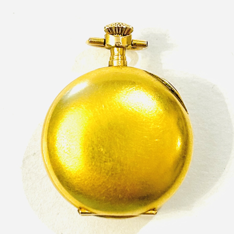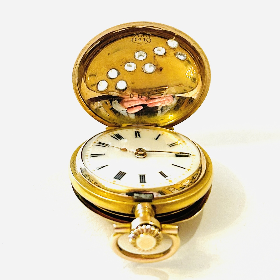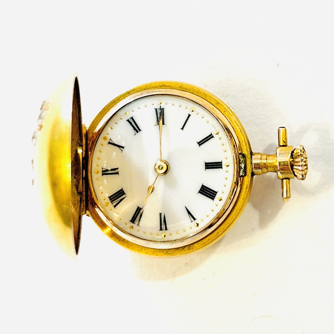 Půvabné tříplášťové dámské kapesní hodinky/jeptišky, přední frontální plášť s motivem 3 trojlístků, jež jsou osazeny přírodními leukosafíry kulatého brusu, zadní plášť ponechán hladký, efektně potaženo matným dukátovým zlatem. Bílý porcelánový číselník s černými římskými číslicemi, decentní zlatavé ručičky (hodinová a minutová). Historický, praktický doplněk, švýcarská hodinářská a zlatnická práce z přelomu 19. a 20. století století dovezená na území monarchie ve stejném období.