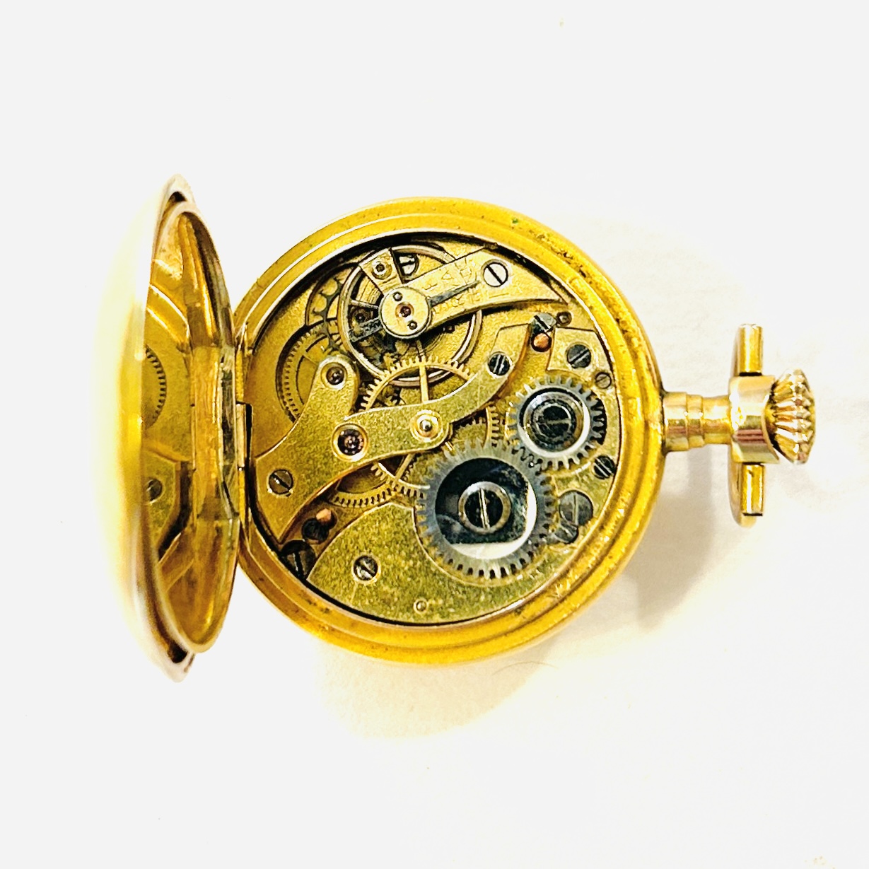 Plášť, prachovka oblík i korunka zhotoveny z narůžovělého žlutého 14 karátového zlata, tj. o ryzosti 585/1000; rakousko-uherský dovozový punc Z-29 (AV) s písmenem \“A\“ (značící vídeňský puncovní úřad) na krčku, švýcarský punc (veverka), ryzostní a sériová čísla zevnitř plášťů. Hmotnost 16,56 g, délka včetně oblíku 37 mm, šířka 26 mm. Mechanický strojek s válcovým krokem plně funkční v roce 2025 profesionálně vyčištěný. Celkově ve velmi zachovalém stavu.