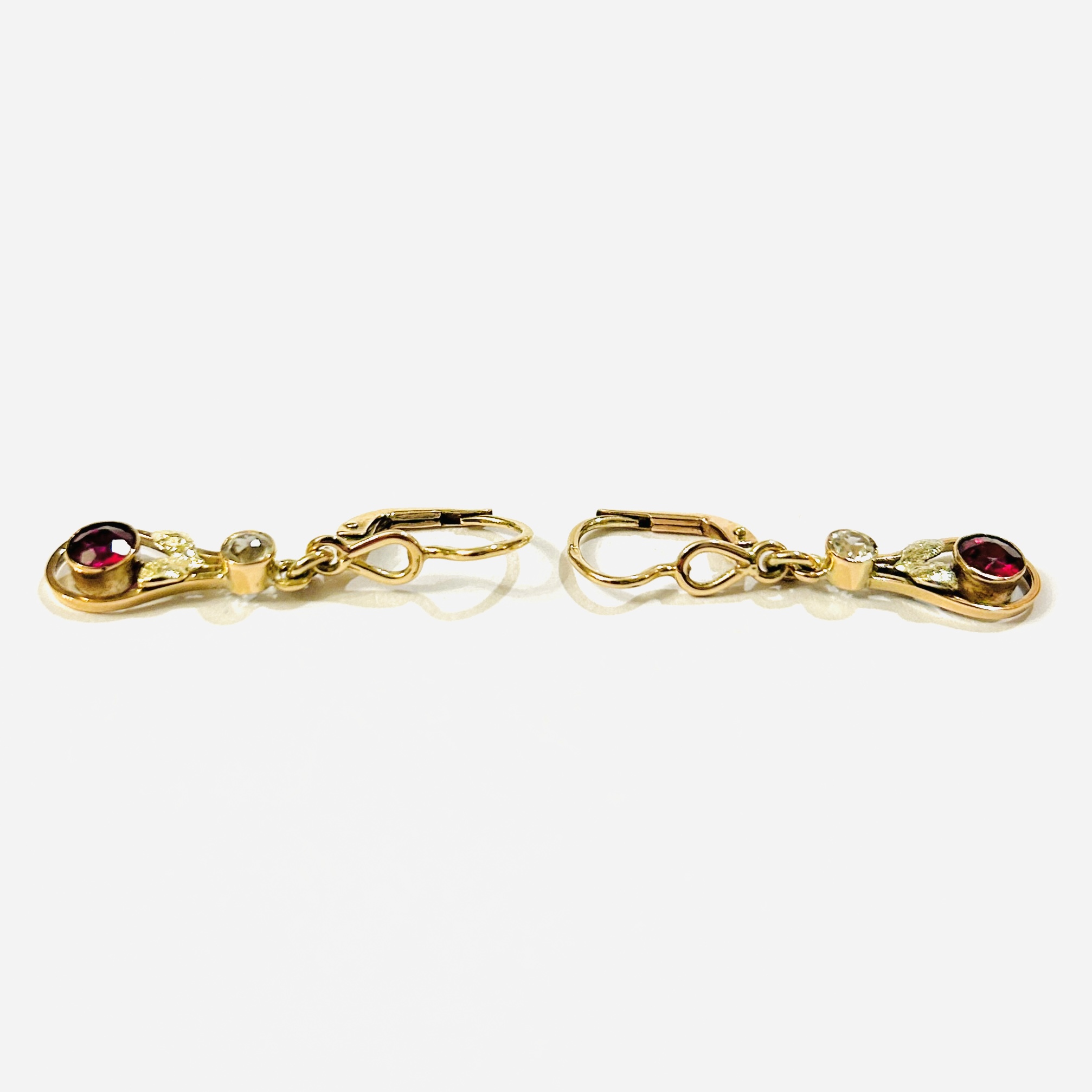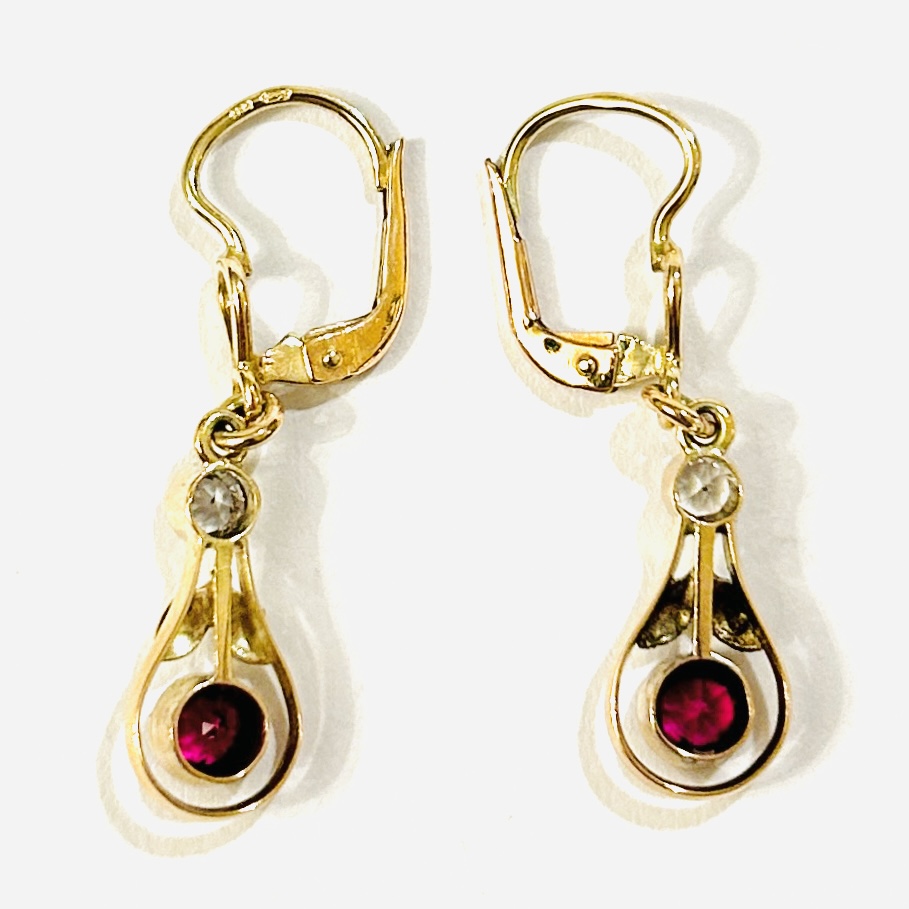 Půvabné visací náušnice z období secese s kapkovými ověsky, ty jsou v obrubách osazeny syntetickými rubíny a leukosafíry kulatého brusu, doplněno jemně rytými lístečky. Autentické ověsky v kombinaci s nově přidaným zapínáním s autorsky invenční smyčkou, pražská klenotnická práce z přelomu 10. a 20. let 20. století a současnou úpravou.