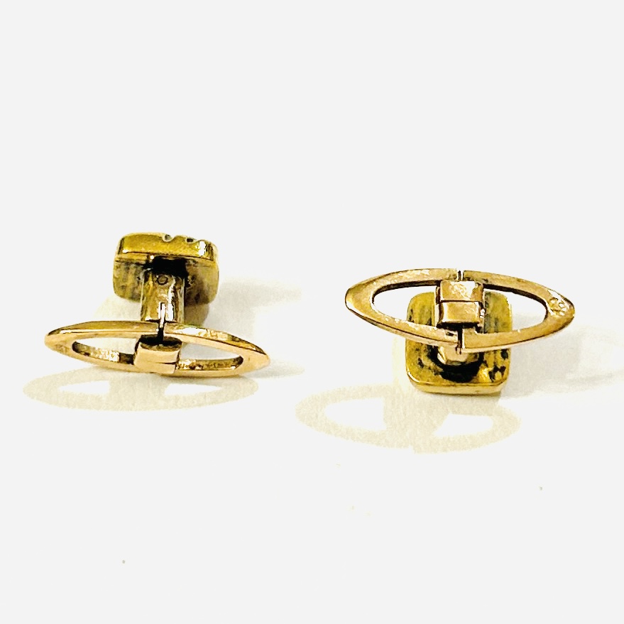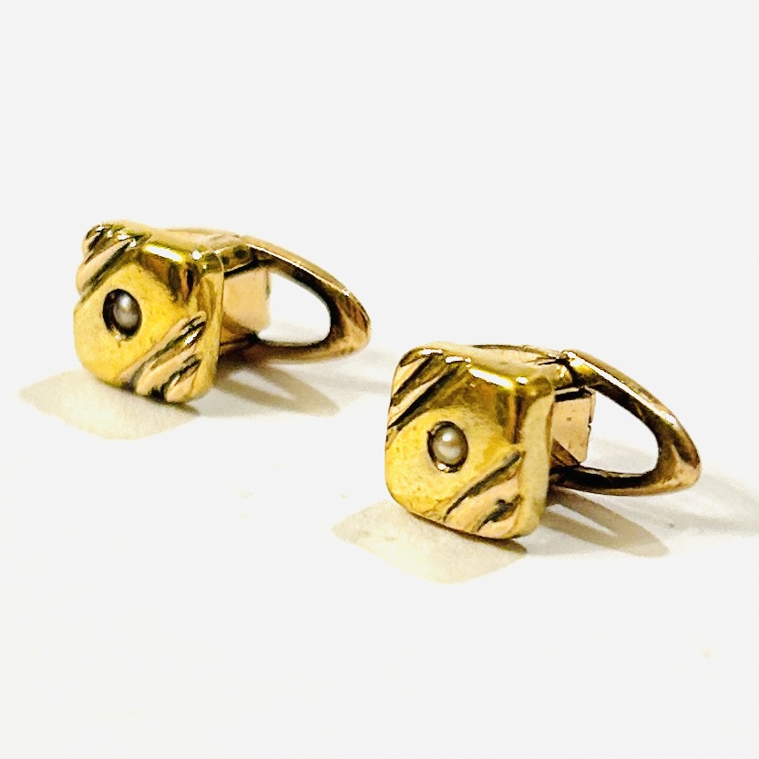 Decentní knoflíčky do náprsenky s čtvercovou hlavicí osazenou ve středu přírodní bílo-šedou perlou, při rozích přepásané plastickými liniemi. Lze nosit i jako drobné manžetové knoflíčky do francouzské manžety. Kvalitní západoevropská zlatnická práce z poslední čtvrtiny 19. století.