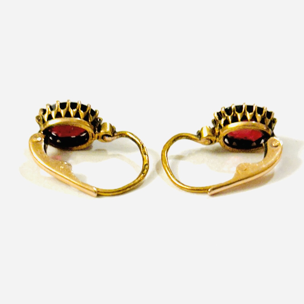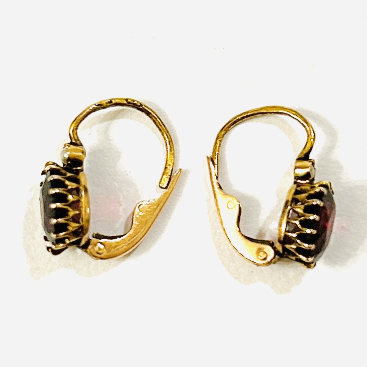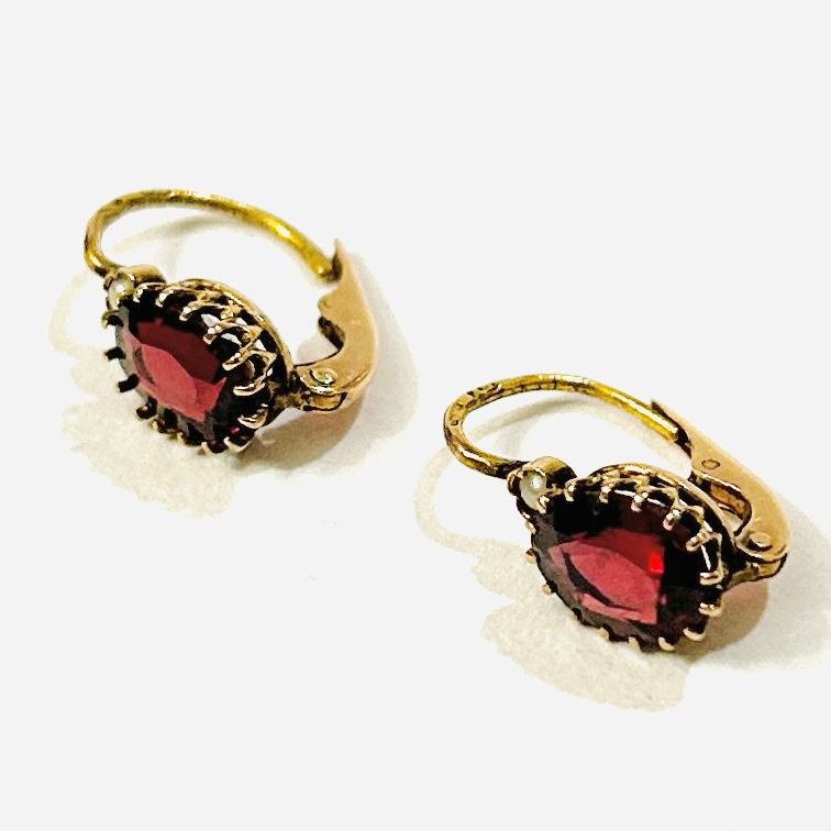 Elegantní, decentní náušnice osazené v mnohokrapnové koruně přírodními almandiny oválného brusu, nad nimi vždy doplněno o drobnou přírodní bílou perlu. Kvalitní pražská zlatnická práce počátku 20. století.