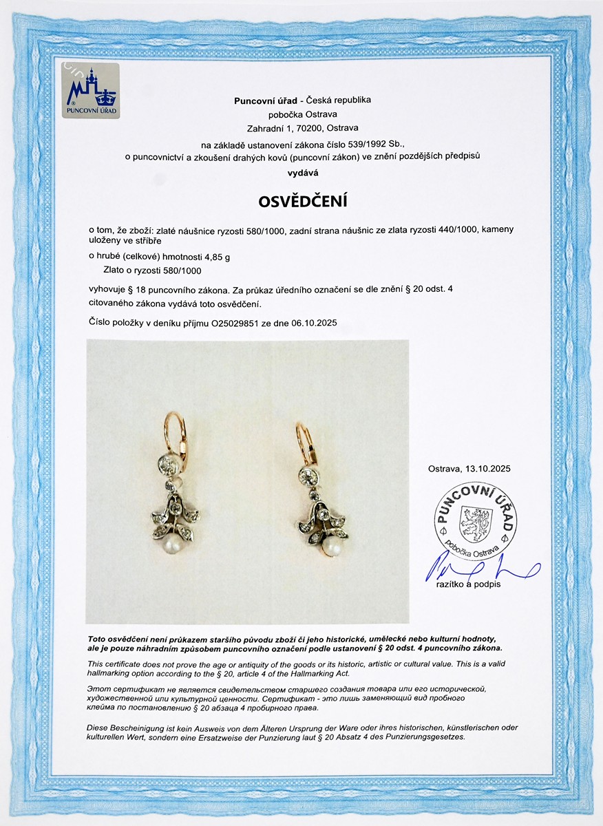 Materiál: žluté zlato o ryzosti 580/1000, zadní strana náušnic ze zlata o ryzosti 440/1000
