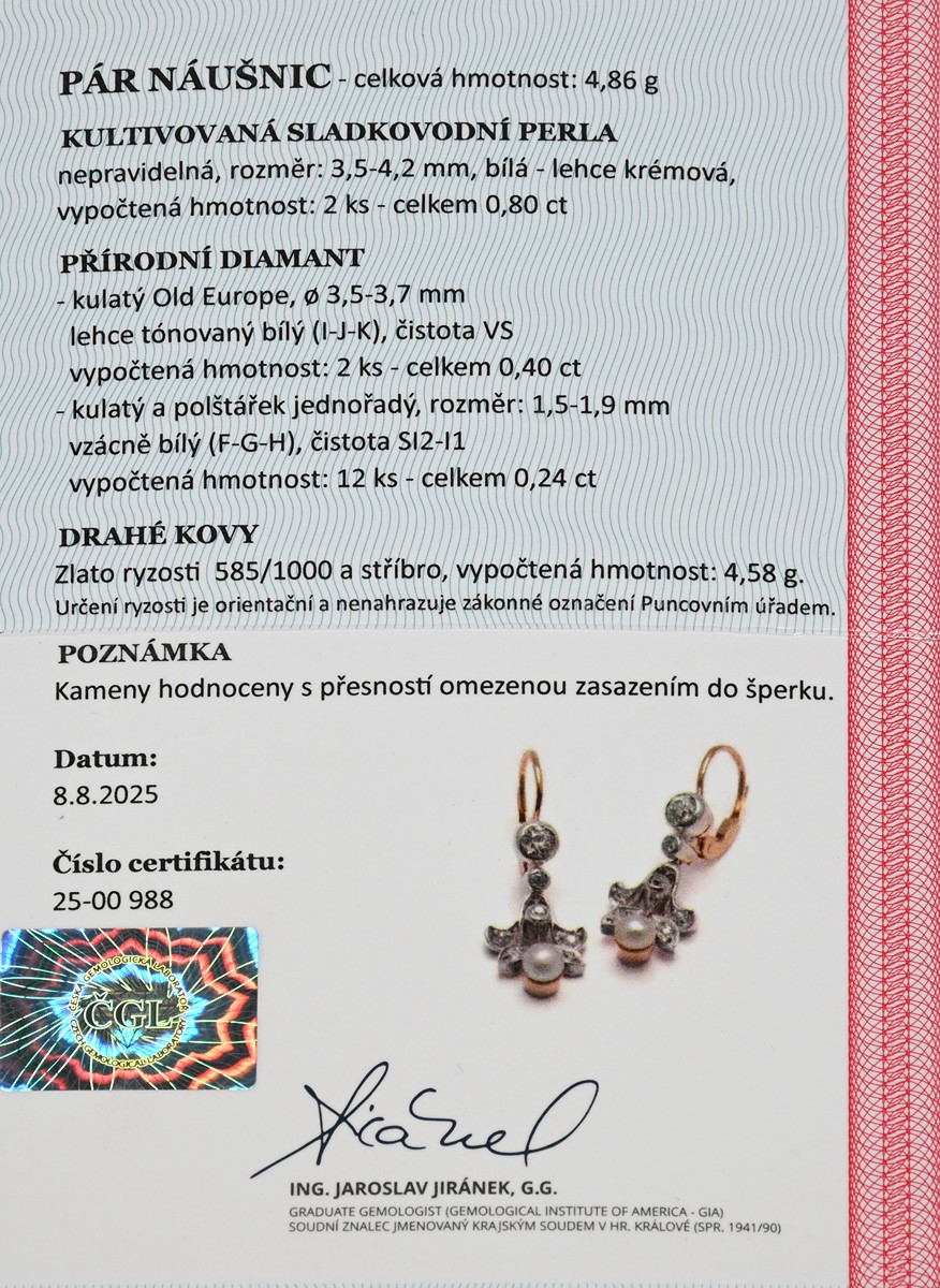 2 ks přírodních diamantů Old Europe 0,40 ct celkem, lehce tónované bílé (I–J–K), čistota VS, průměr 3,5–3,7 mm,