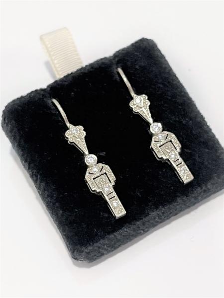 Zajímavé zlaté náušnice z bílého 14 karátového zlata AU 585/000 s bílými kamínky, váha náušnic 3,10 gramů brutto, délka náušnic cca 3 cm. Visací náušnice s oblíbeným klasickým zapínáním. Hezký stav, odborně vyčištěno,