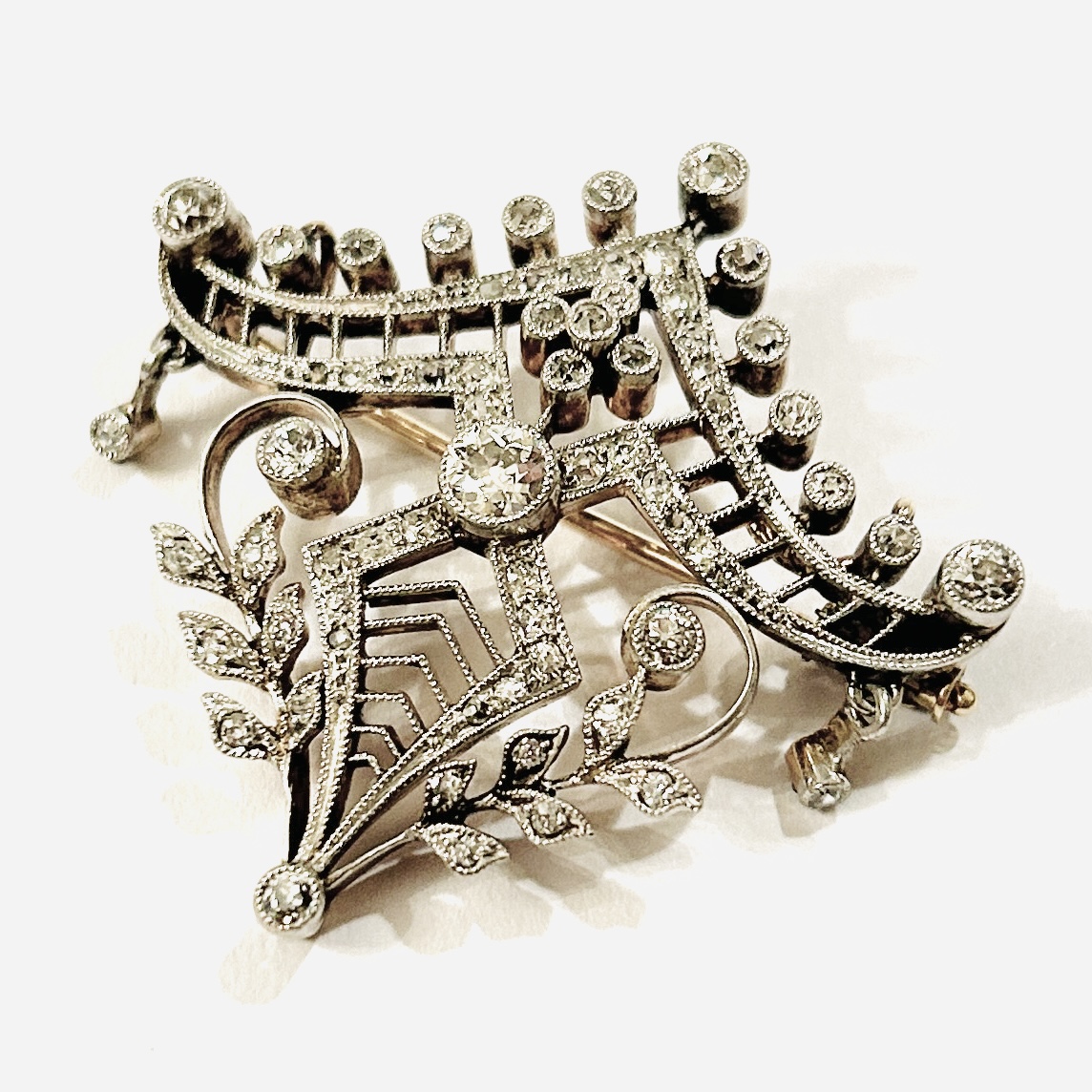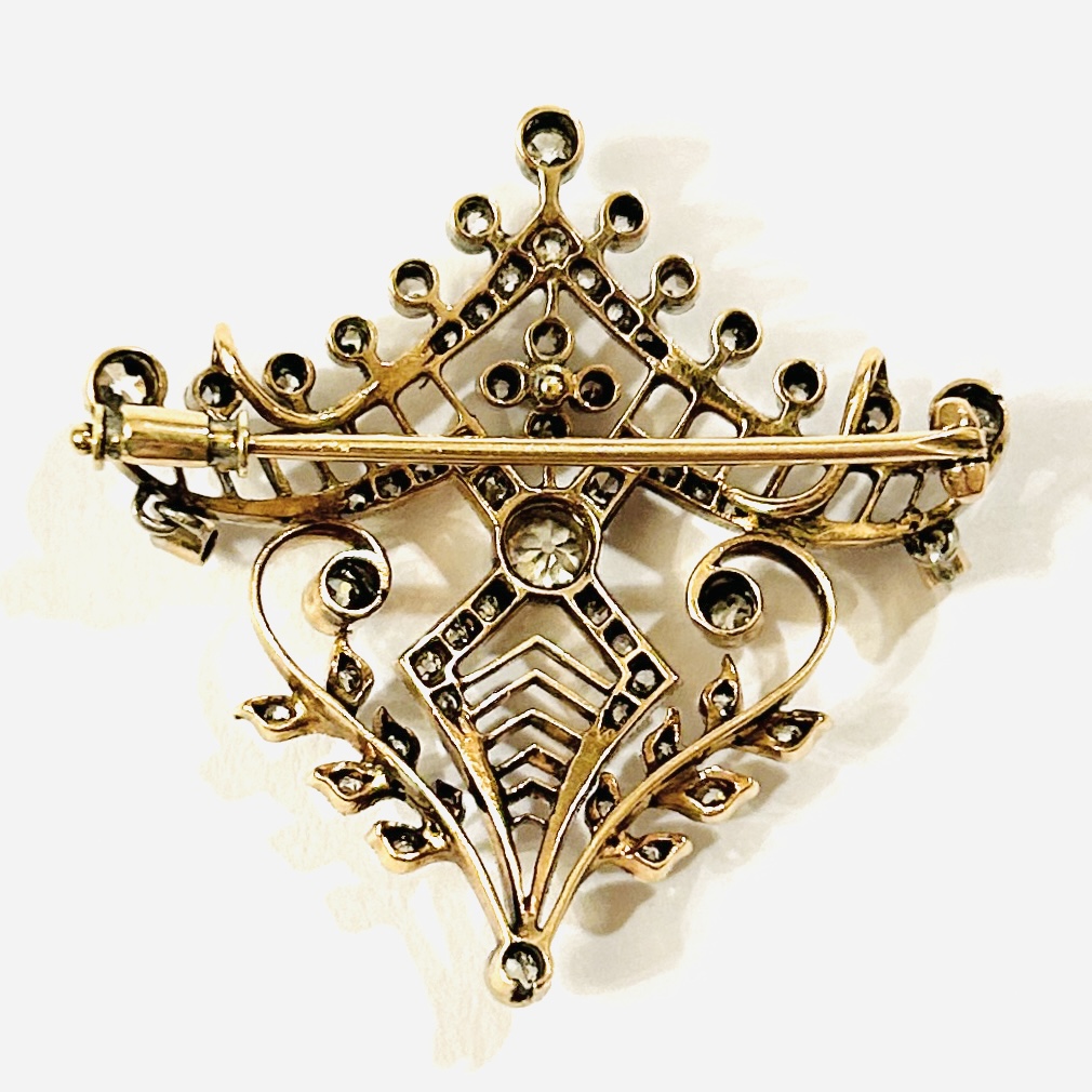 Půvabná, aristokratická brož z období secese s patrnou inspirací Japonskem, tělo připomínající orientální stříšku doplněnou stylizovanými florálními křivkami a dvěma decentními ověsky. Bohatě prořezáváno a zušlechtěno technikou zrnkování. Osazeno přírodními diamanty, centrální kulatého starého briliantového brusu o váze 0,23 ct, čistota VVS1 (!), barva J-K, další kameny stejného typu brusu, kulatým jednoduchým (achtkant) a routovým brusem, celková váha 1,07 ct (63 ks), jejichž kvalita je dobrá až střední, celkem je šperk osazen 1,30 ct. Precizní západoevropská klenotnická práce z nultých let 20. století.