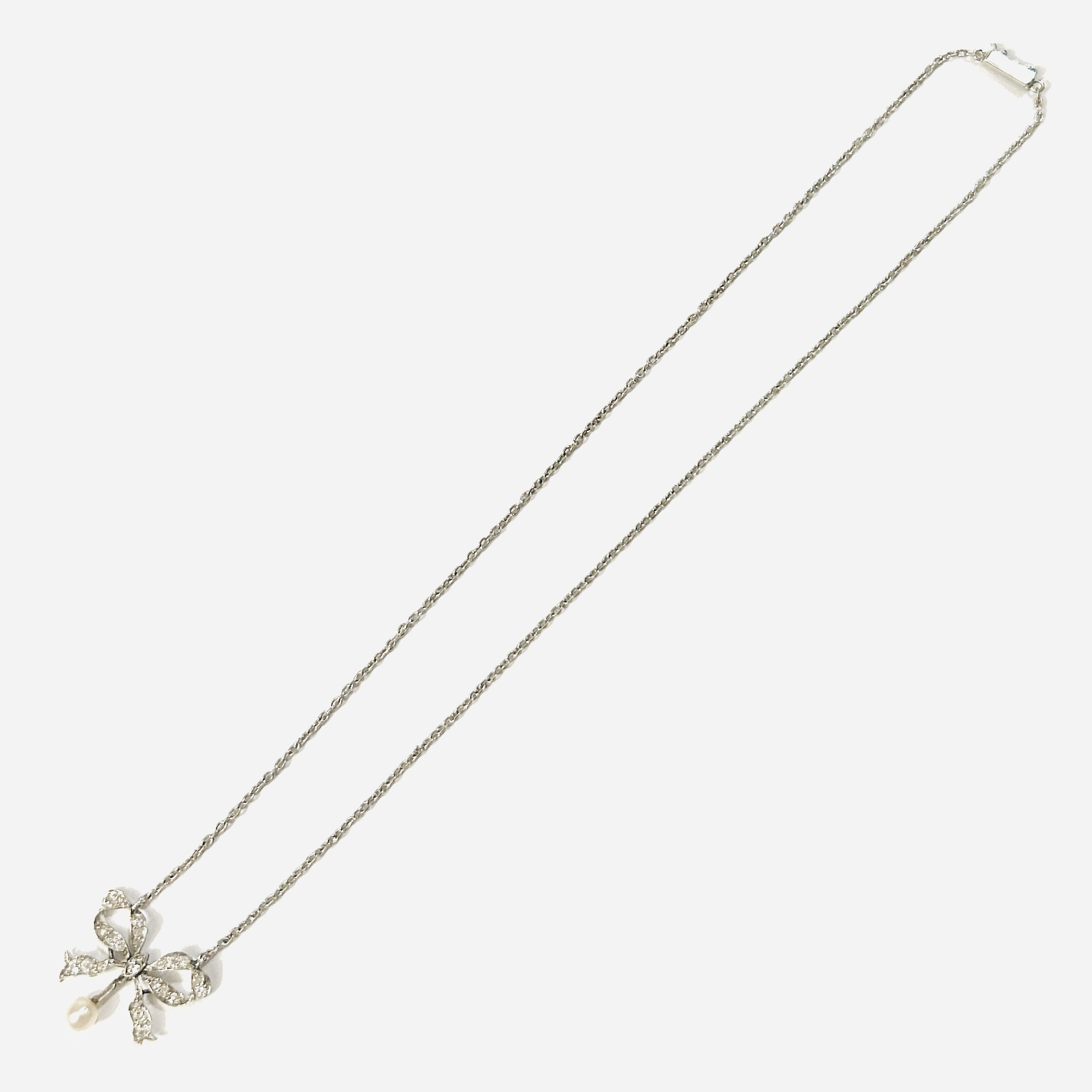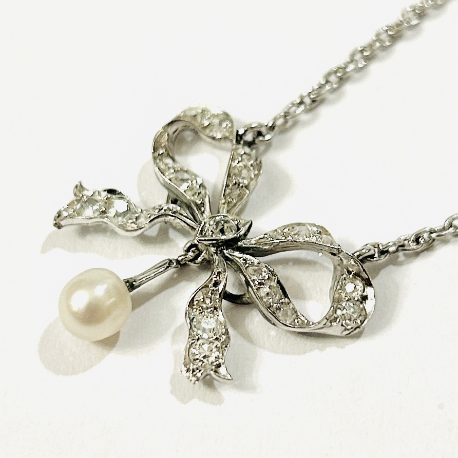 Půvabný, jemný náhrdelník z období secese, ozdobná část ve tvaru stylizované mašle osázená přírodními diamanty kulatého jednoduchého brusu (achtkant) o celkové váze 0,49 ct (23 ks), jejichž kvalita je dobrá, v ověsku osazeno bílou perlou o průměru 4,5 mm, u níž není vyloučen přírodní-divoký původ. Západoevropská klenotnická práce z počátku 20. století.
