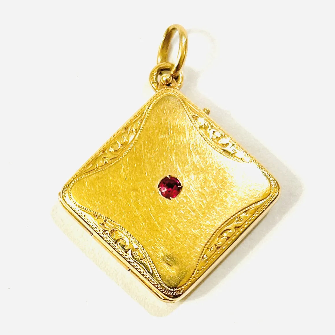 Frontální část zhotovena z narůžovělého žlutého 8,9 karátového zlata, tj. o ryzosti 370/1000, ze stříbra provlékací očko o ryzosti 890/1000, spodní část o ryzosti 630/1000; vyhotoveno osvědčení puncovního úřadu, neznačeno. Hmotnost 10,20 g, celková délka 51 mm, šířka 31 mm. V minulosti opravováno, místy lehké promáčkliny, zohledněno v ceně, jinak v dobrém stavu.
