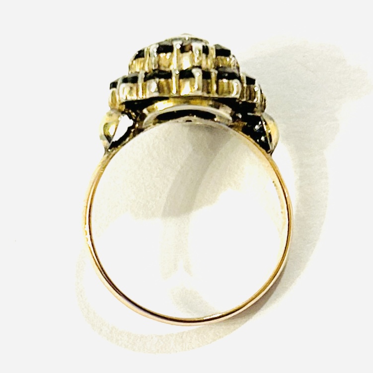 Starožitný prsten s hlavicí v podobě kulatého květu, která je ve dvou stupních osázena 21 českými granáty kulatého hvězdicového brusu, fasováno zrnkovou technikou a plně přiléhající obrubou. Německá zlatnická práce z 2. poloviny 20. století.