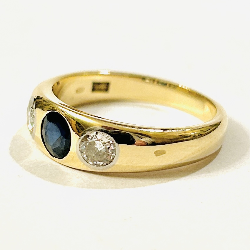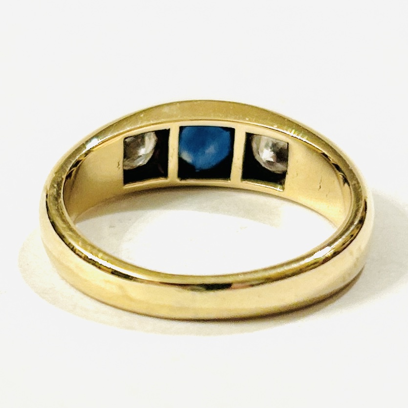 Nadčasový alianční prsten osazený 2 přírodními diamanty kulatého briliantového brusu o celkové váze 0,52 ct (každý 0,26 ct), ve středu osazeno přírodním modrým safírem o váze 0,70 ct, kvalita kamenů je dobrá. Diamanty efektně fasovány v orámování z bílého zlata. Solidní šína, pohodlné nošení díky zapuštěnému fasování. Západoevropská, patrně německá klenotnická práce z 3. čtvrtiny 20. století.