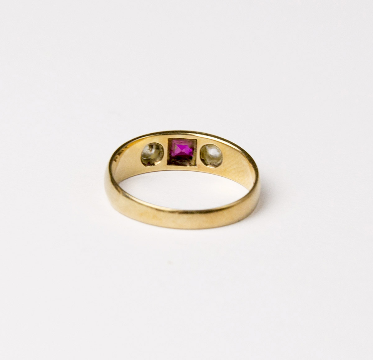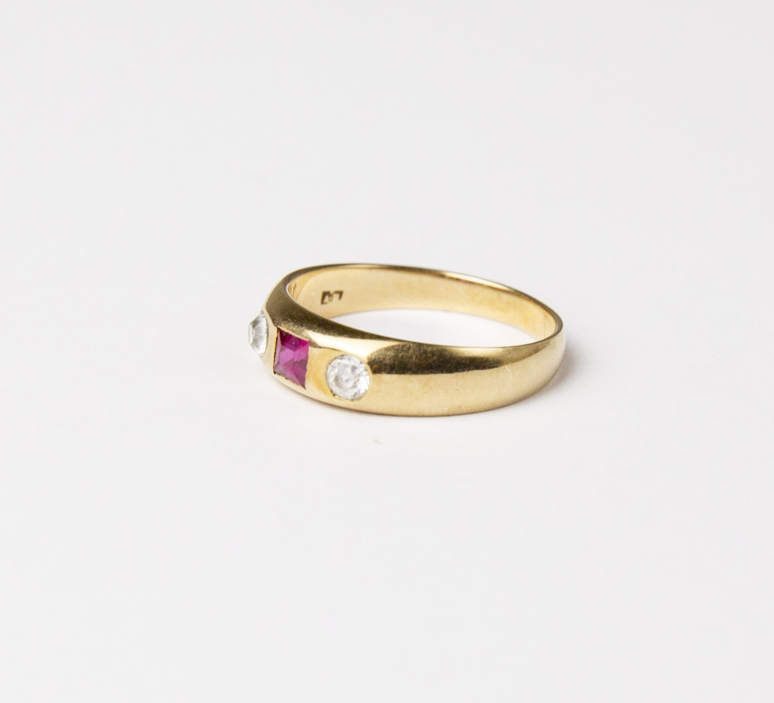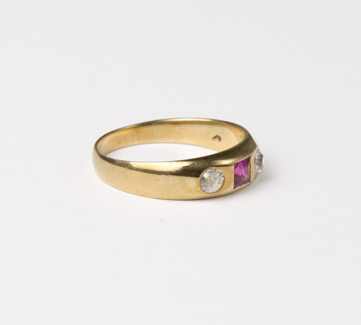 zlatý alianční prsten s leukosafíry starého briliantového brusu a syntetickým rubínem, Au 3,59 g/580/1000, Čechy, kolem roku 1910, puncováno (liška), velikost prstenu 58,5