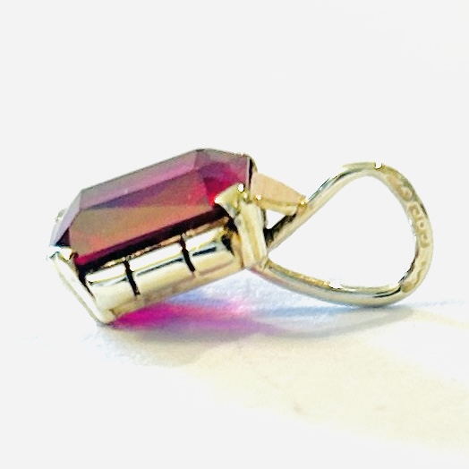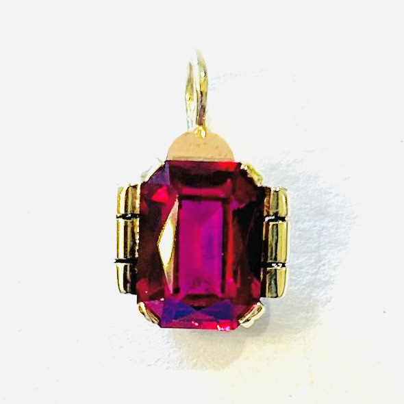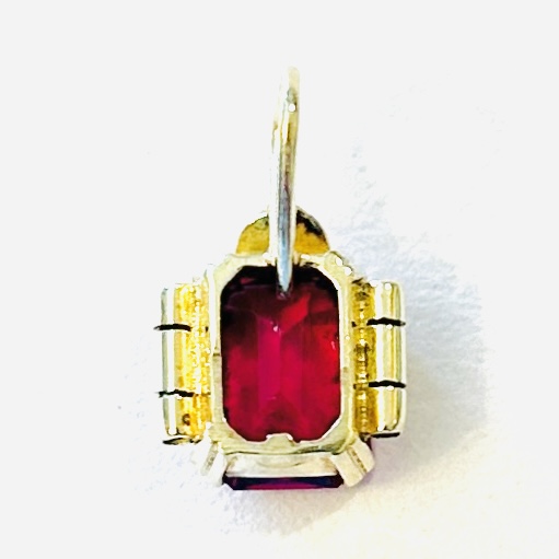 Decentní přívěšek z období pozdního art-deco, osazeno sytým syntetickým rubínem obdélného brusu, po stranách válcovité přístavky. Kvalitní tuzemská zlatnická práce z 50. let 20. století inspirovaná šperkařstvím počátku 40. let stejného věku.