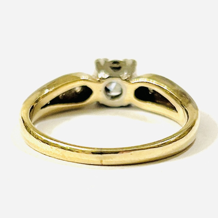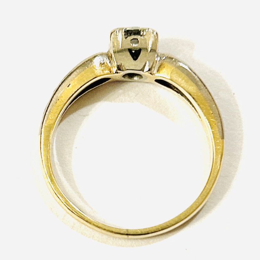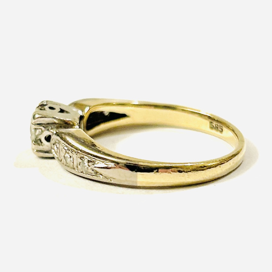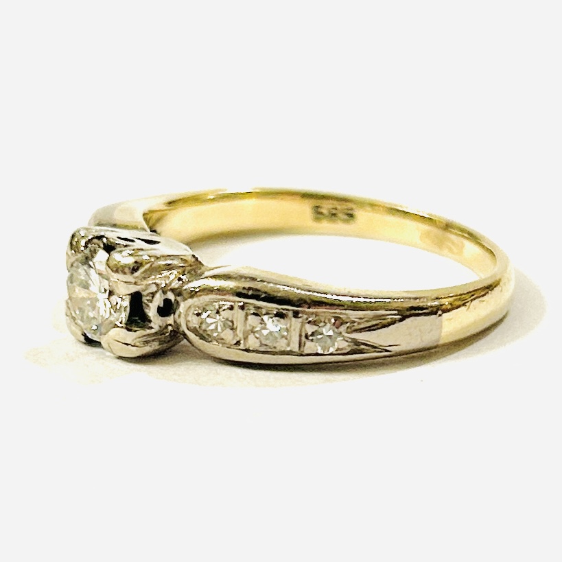 Elegantní, zářivý prsten osazen ve čtvercové koruně přírodním diamantem kulatého briliantového brusu o hmotnosti 0,33 ct, čistota VS1, barva K-L, po stranách doplněno přírodními diamanty kulatého jednoduchého brusu (achtkant) o váze 0,14 ct (0,023 ct – 6 ks), jež jsou dobré kvality, celková hmotnost kamenů 0,47 ct. Fasováno v lůžkách z bílého zlata, centrální koruna opatřena zdobnými průsvitkami. Šperk zásnubního typu v doznívajícím stylu art-deco, kvalitní západoevropská klenotnická práce z 50. let 20. století.