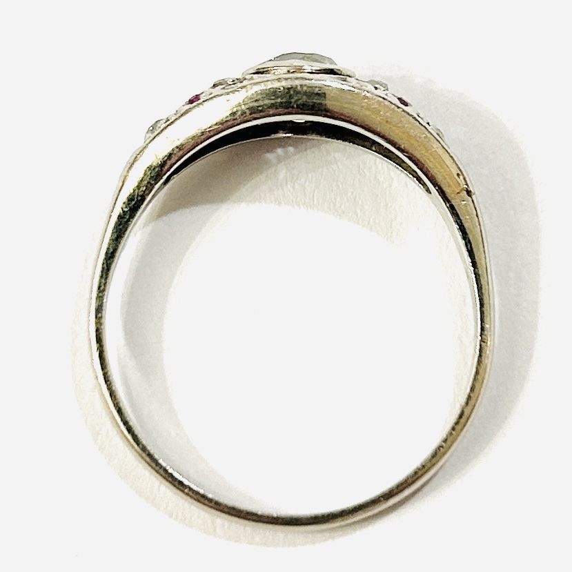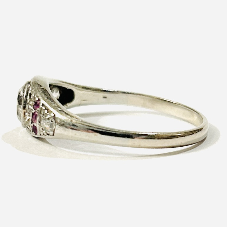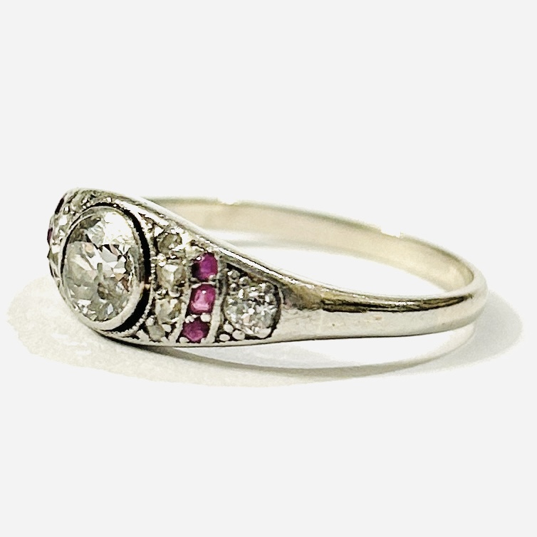 Sympatický, elegantní prsten z období art-deco. Zaoblená hlavice osazena solitérním přírodním diamantem starého briliantového brusu o váze 0,57 ct, čistota P2, barva K-L, dobrá brilance, fasováno v plně přiléhající obrubě. Dále po stranách doplněno přírodními diamanty též starého kulatého briliantového, routového a jednoduchého kulatého brusu (achtkant) brusu o společné váze 0,17 ct (0,06 ct – 2 ks; 0,006 ct – 7 ks; 0,01 ct – 1 ks), jejich kvalita je dobrá až nízká, v kombinaci s 6 přírodními rubíny kulatého brusu, fasováno v zrnitých krapnových lůžkách, celková hmotnost diamantů 0,74 ct. Západoevropská klenotnická práce z 20. let 20. století.