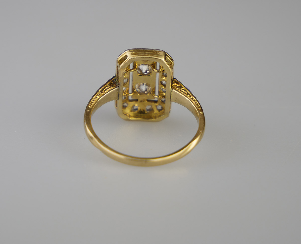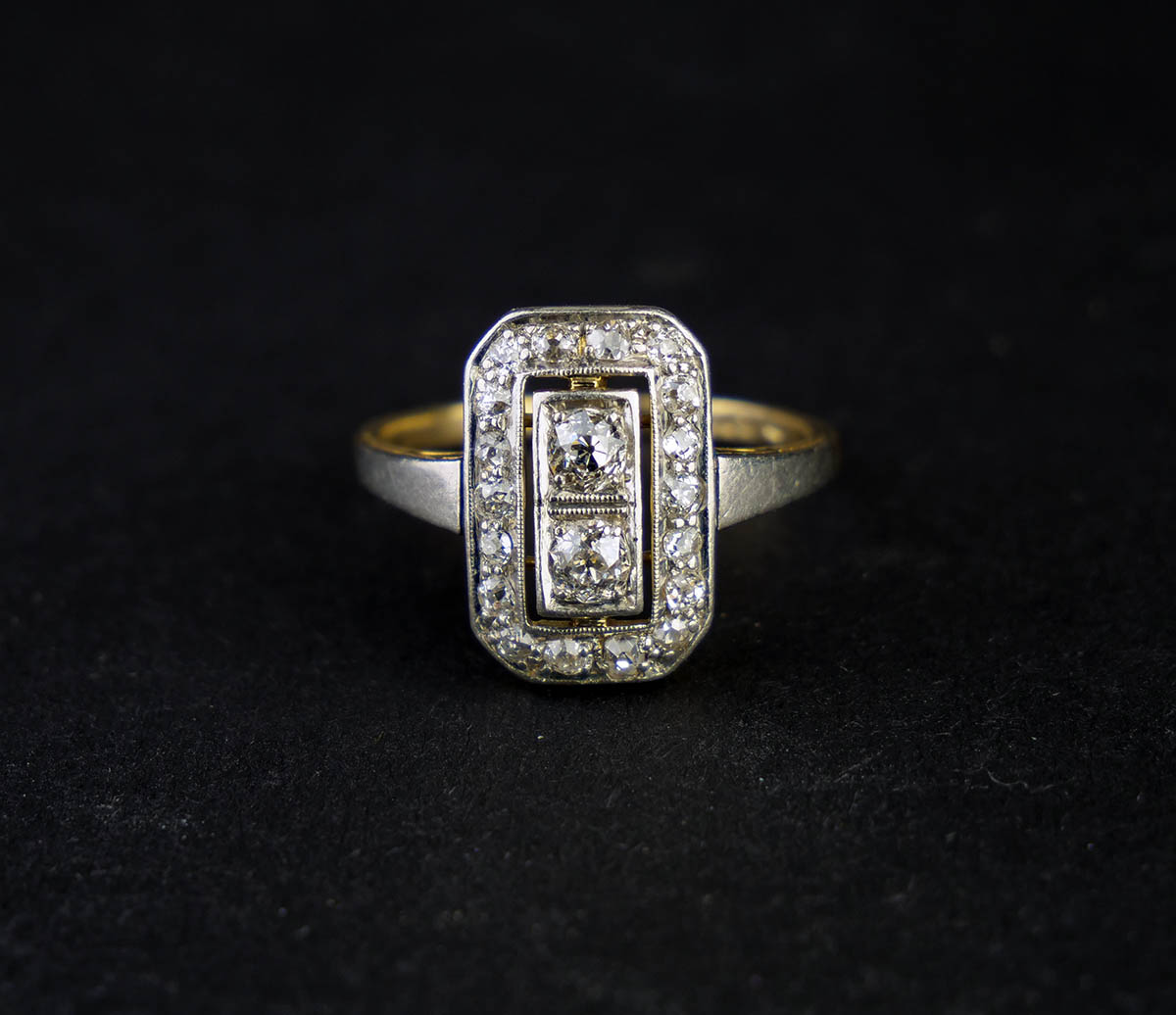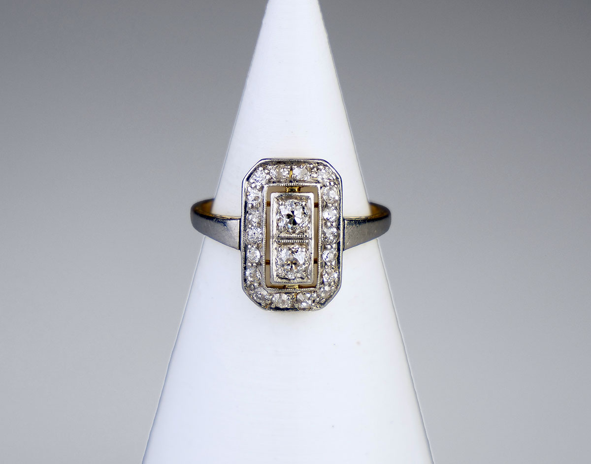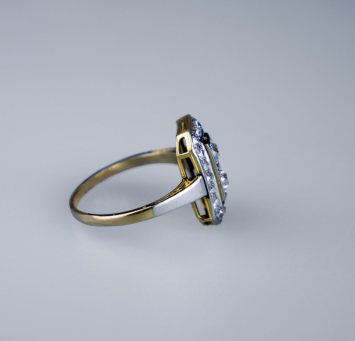 Zlatý dvojbarevný art-deco prsten s diamanty briliantového brusu, celkem 0,95 ct, barva H-I, kvalita VS1-SI1. Celková hmotnost Au 3,45 g/585/1000, punc. Západní Evropa, první třetina 20. století, velikost prstenu 54.