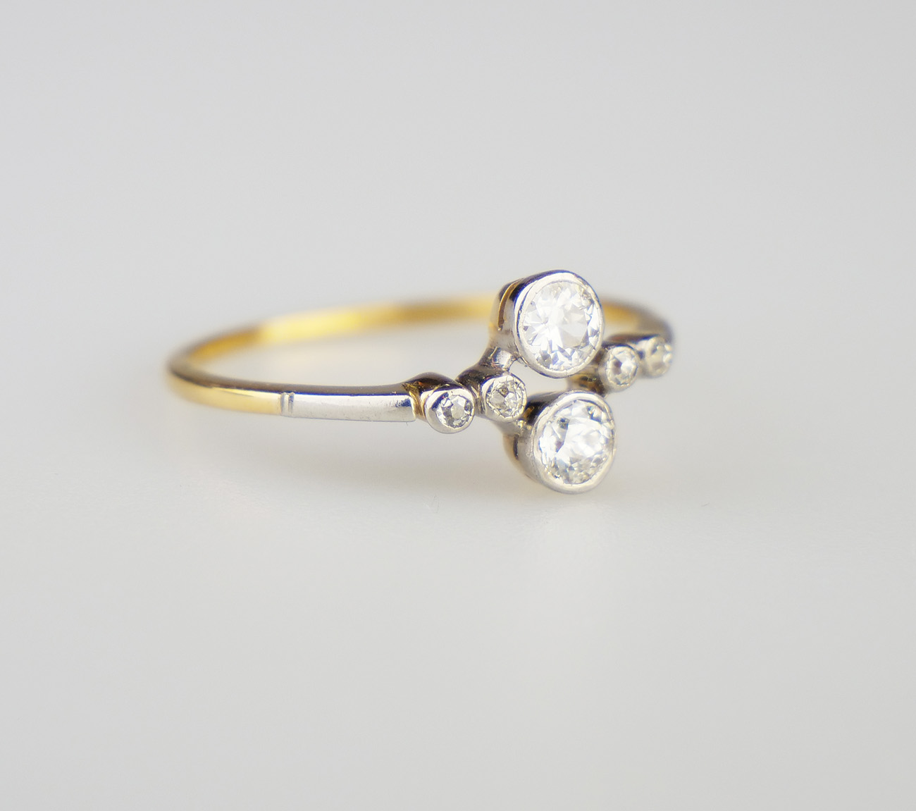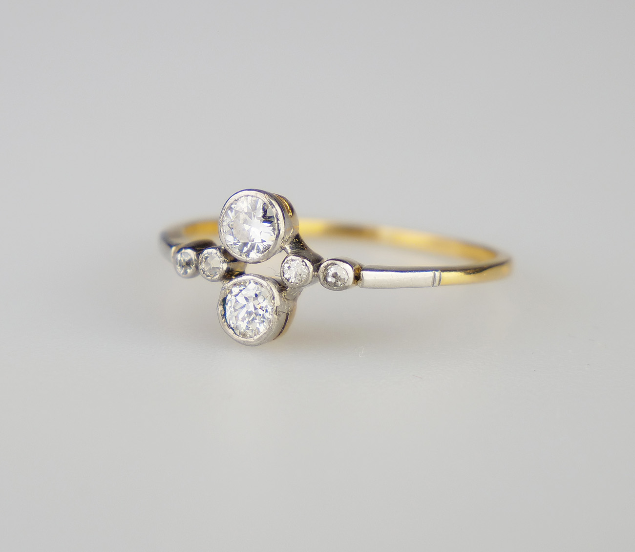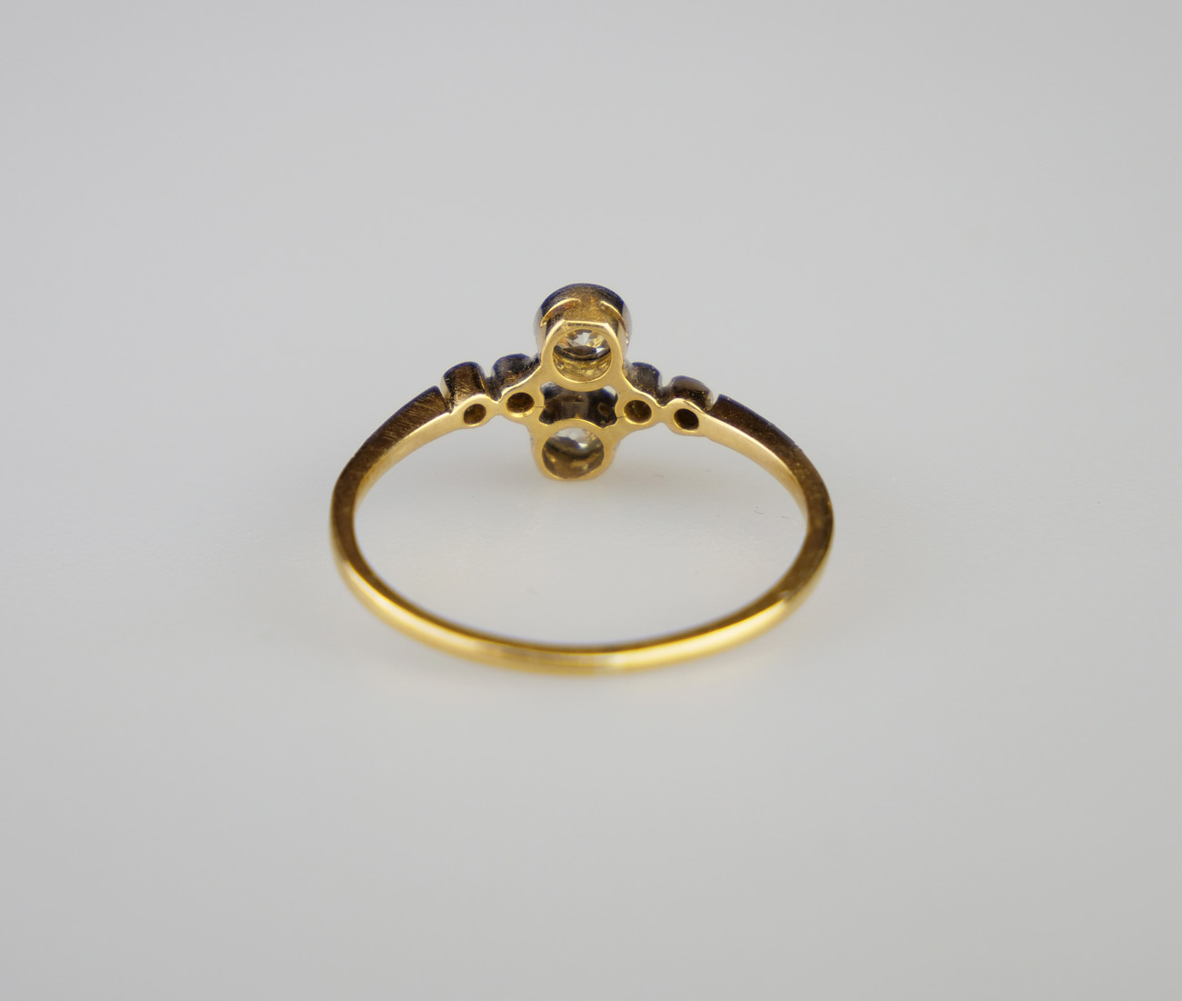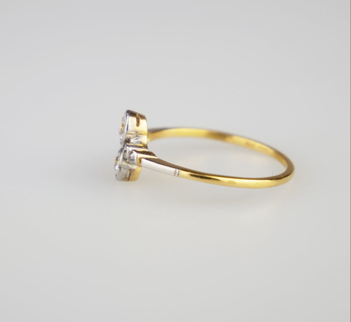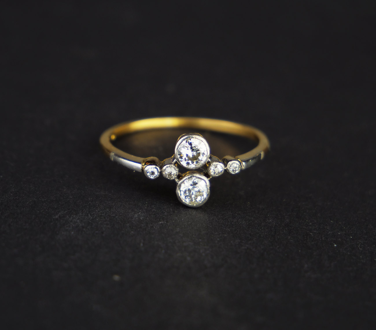 Zlatý art-deco prsten s diamanty, hmotnost 6 diamantů briliantového brusu 0,47 ct, barva H-I, kvalita SI. Celková hmotnost Au 2,05 g/585/1000, punc. Západní Evropa, první třetina 20. století, velikost prstenu 57,5