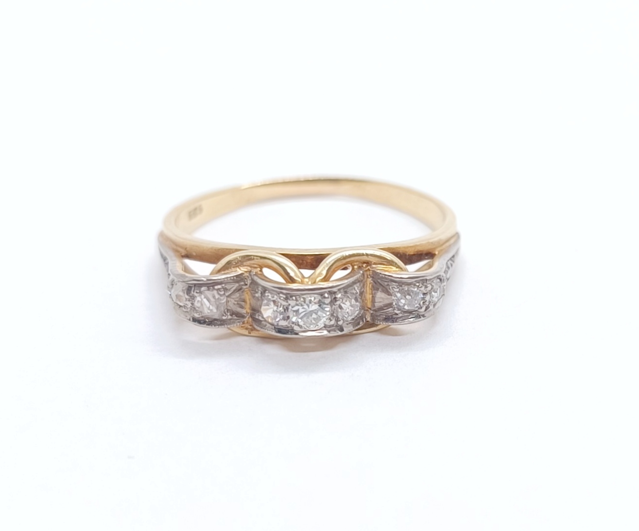 Zlatý art deco prsten s diamanty starého briliantového brusu o celkové hmotnosti cca 0,34 ct, Au btto 2,95g/585/1000, 20. léta 20. století, západní Evropa, atest puncovního úřadu; velikost prstenu 56