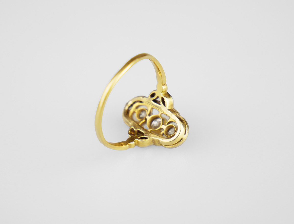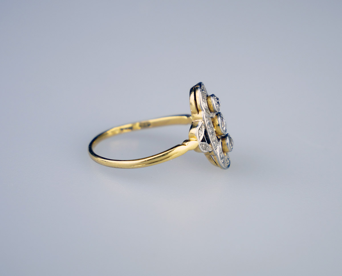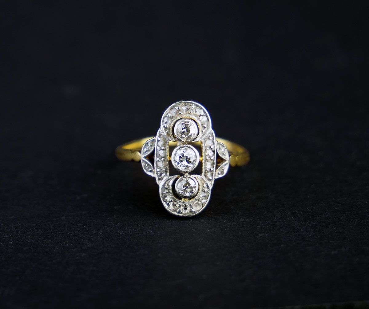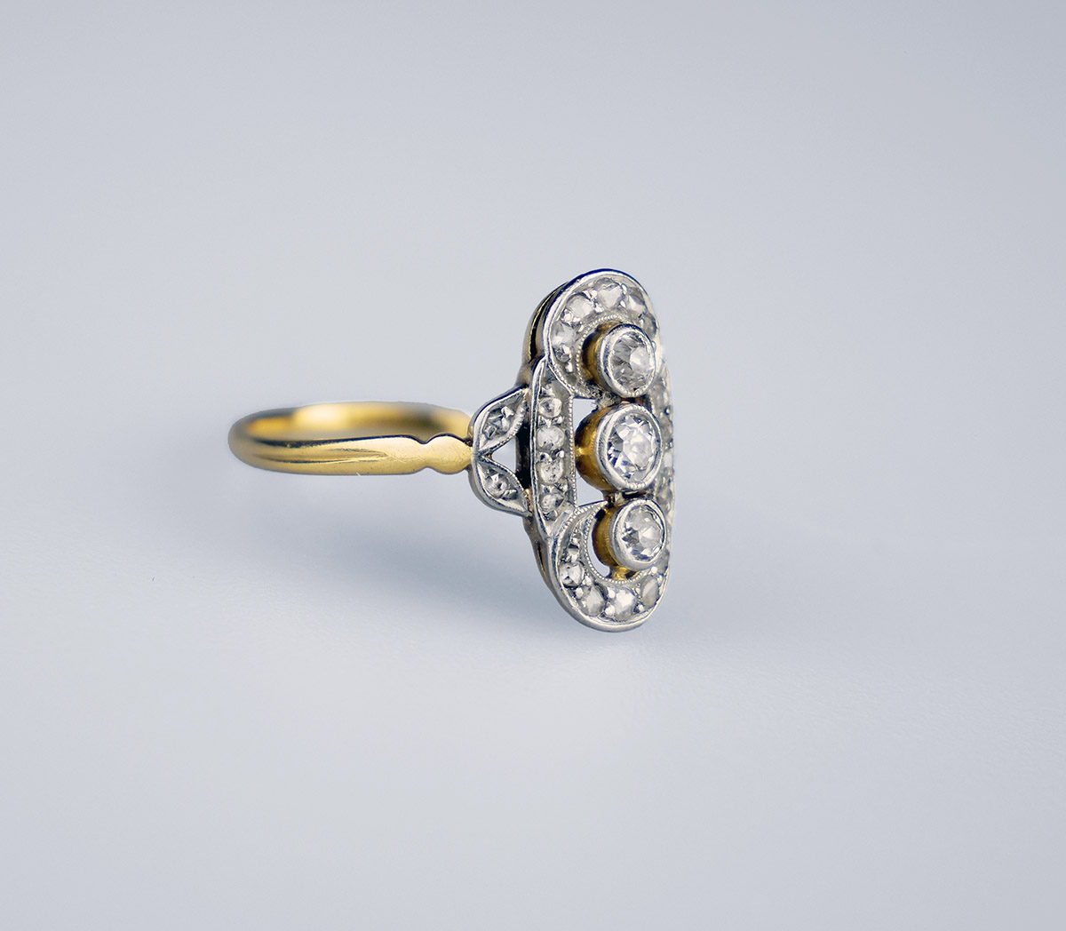 Zlatý art-deco prsten s diamanty briliantového a routového brusu, celkem 0,30 ct, barva I-J, kvalita SI. Celková hmotnost Au 2,55 g/585/1000, punc. Západní Evropa, první třetina 20. století, velikost prstenu 50.
