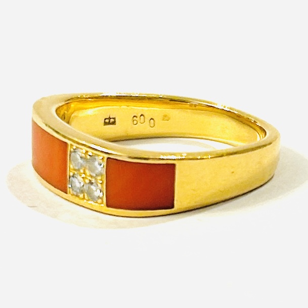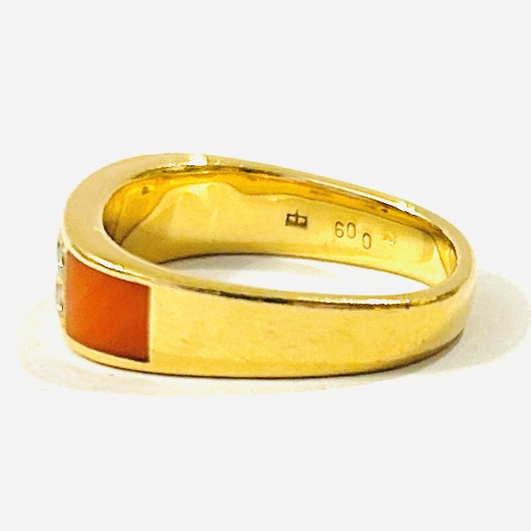 Designový, nevšední prsten, který je osazen precizně zapuštěnými pláty přírodního červeného mořského korálu, přerušeno čtvercem osazeným 4 přírodními diamanty kulatého brusu o celkové váze 0,09 ct, jejichž kvalita je velmi dobrá. Celkový tvar prstenu nezvykle zahraněný v osách. Precizní ateliérová italská práce z poslední pětiny 20. století.