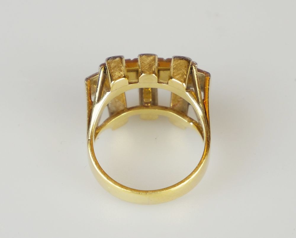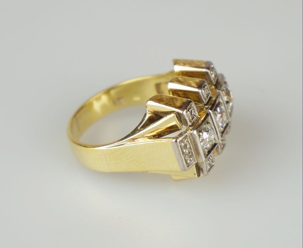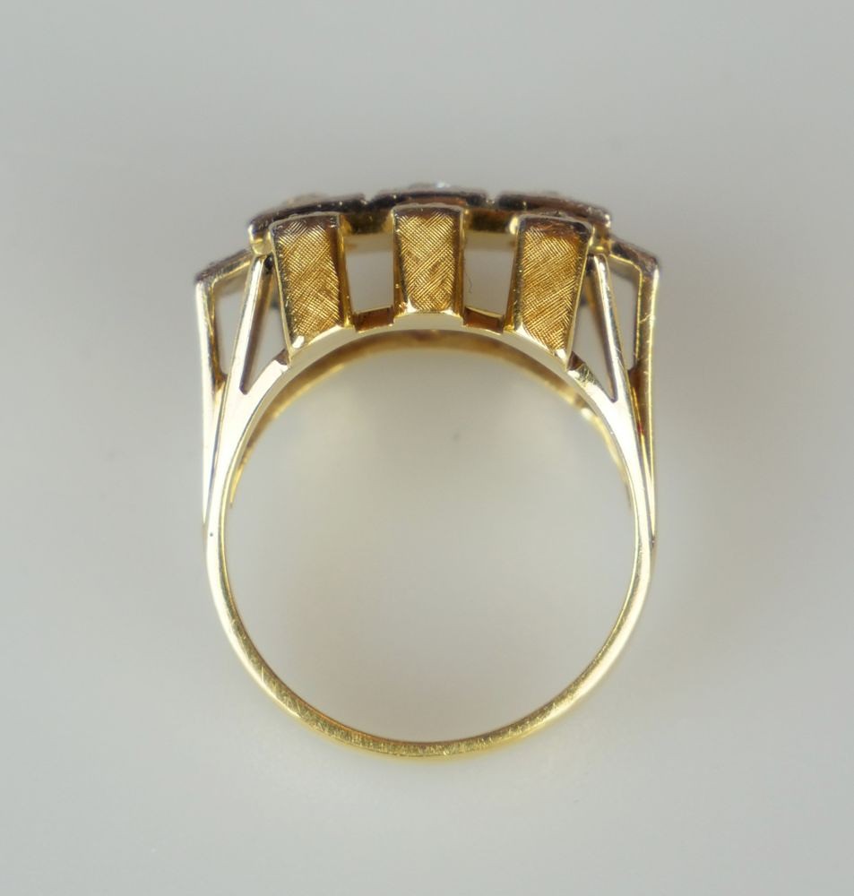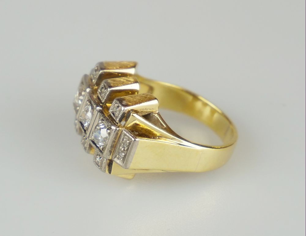 Zlatý brutalistní tvarově nevšední zlatý prsten se 3 diamanty starého briliantového brusu, dobré kvality (0,24 + 0,16 +0,24 ct) a 10 diamanty routového brusu o celkové hmotnosti 0,64 ct. Celková hmotnost Au 10,20g/585/000, punc, odborný posudek. Západní Evropa, 50. léta 20. století, velikost prstenu 54,5.