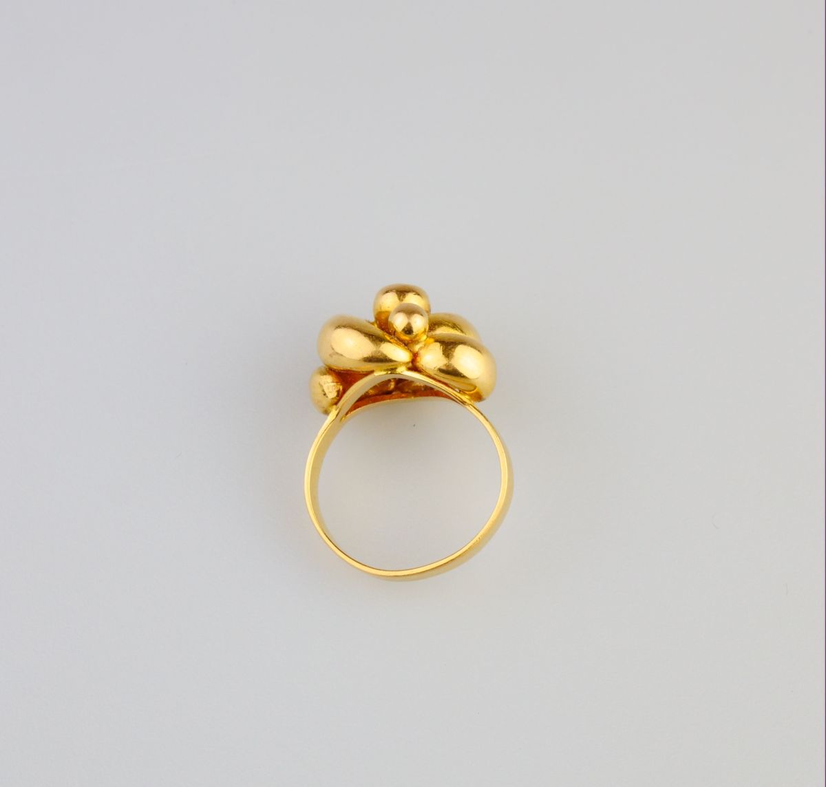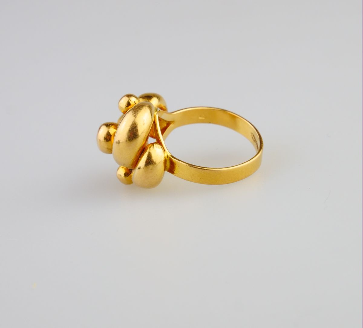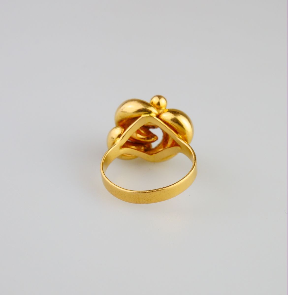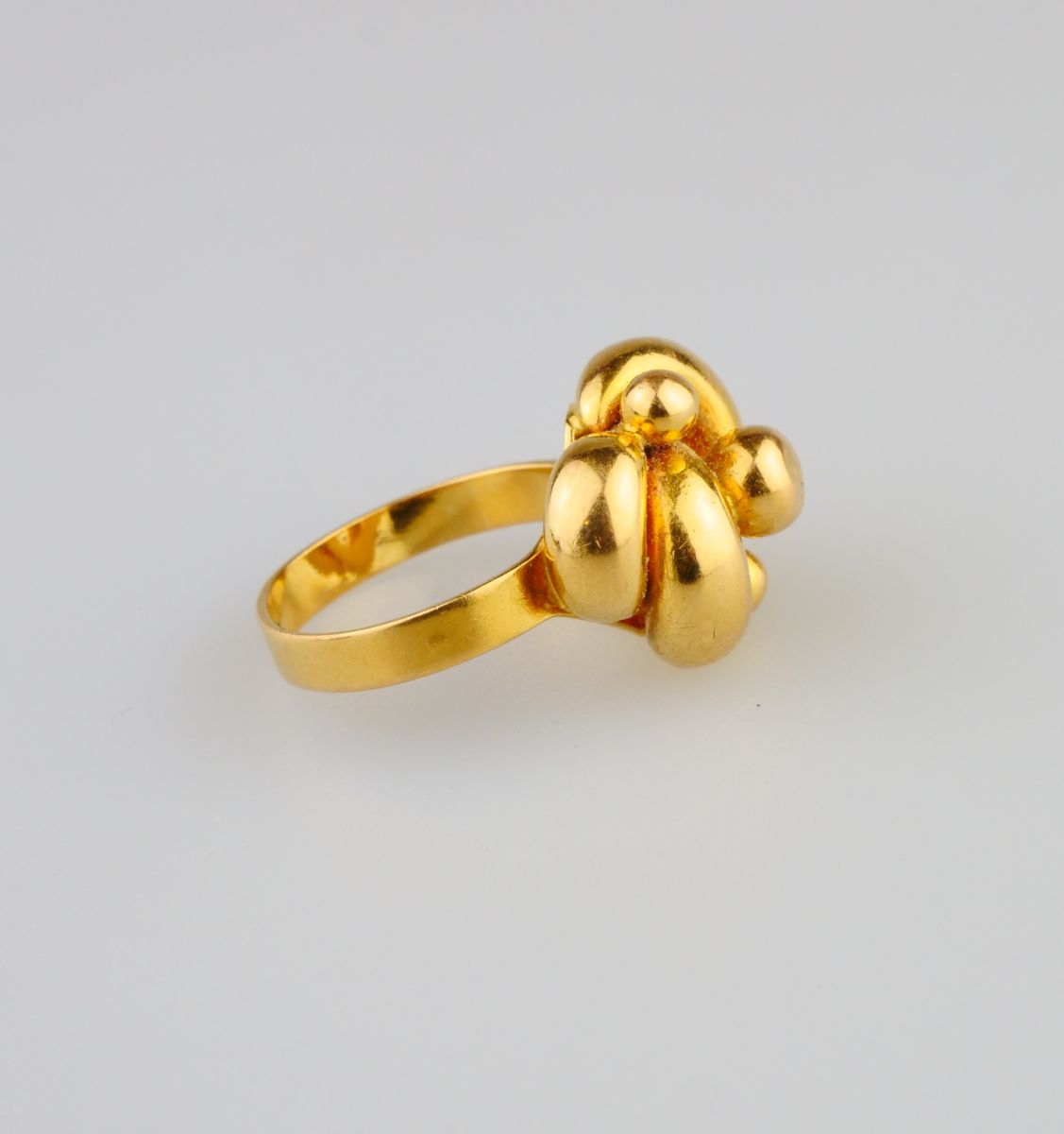 celozlatý prsten s hlavou uzlového tvaru, Au 5,67 g/750/1000, Itálie, kolem r. 1990, italský punc a pozdější český punc (kohout); velikost prstenu 54