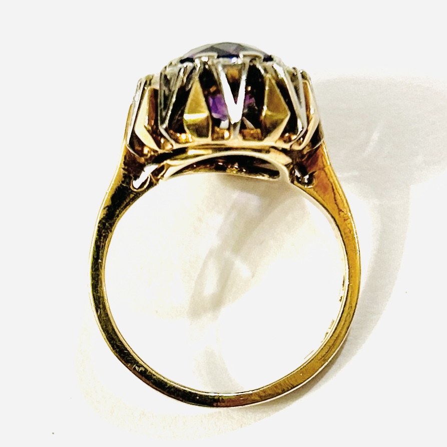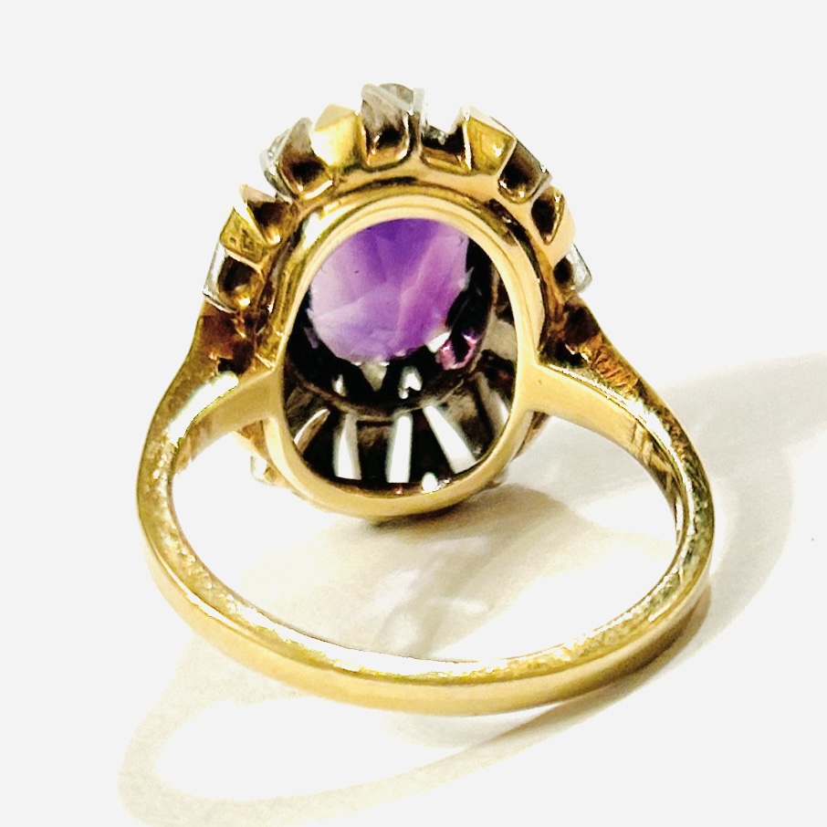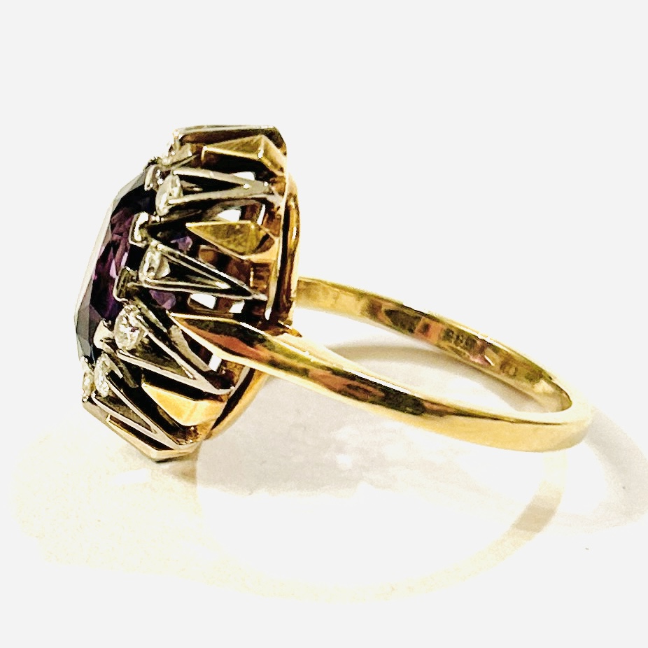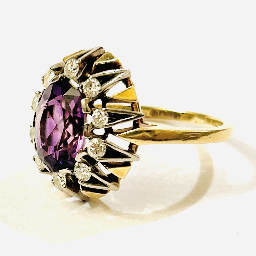 Apartní, koktejlový prsten s hmotnou hlavicí, která je osazena přírodním sytým ametystem oválného brusu, ten je rámován 10 přírodními diamanty kulatého briliantového brusu o celkové váze 0,50 ct (0,05 ct – 10 ks), jež jsou velmi dobré kvality. Fasováno v důmyslných krapnových korunách, konstrukce hlavice v duchu zigzag art-deco využívající efektních odlesků ploch ze žlutého a bílého zlata. Precizní klenotnická západoevropská práce ze 70. až 80. let 20. století.