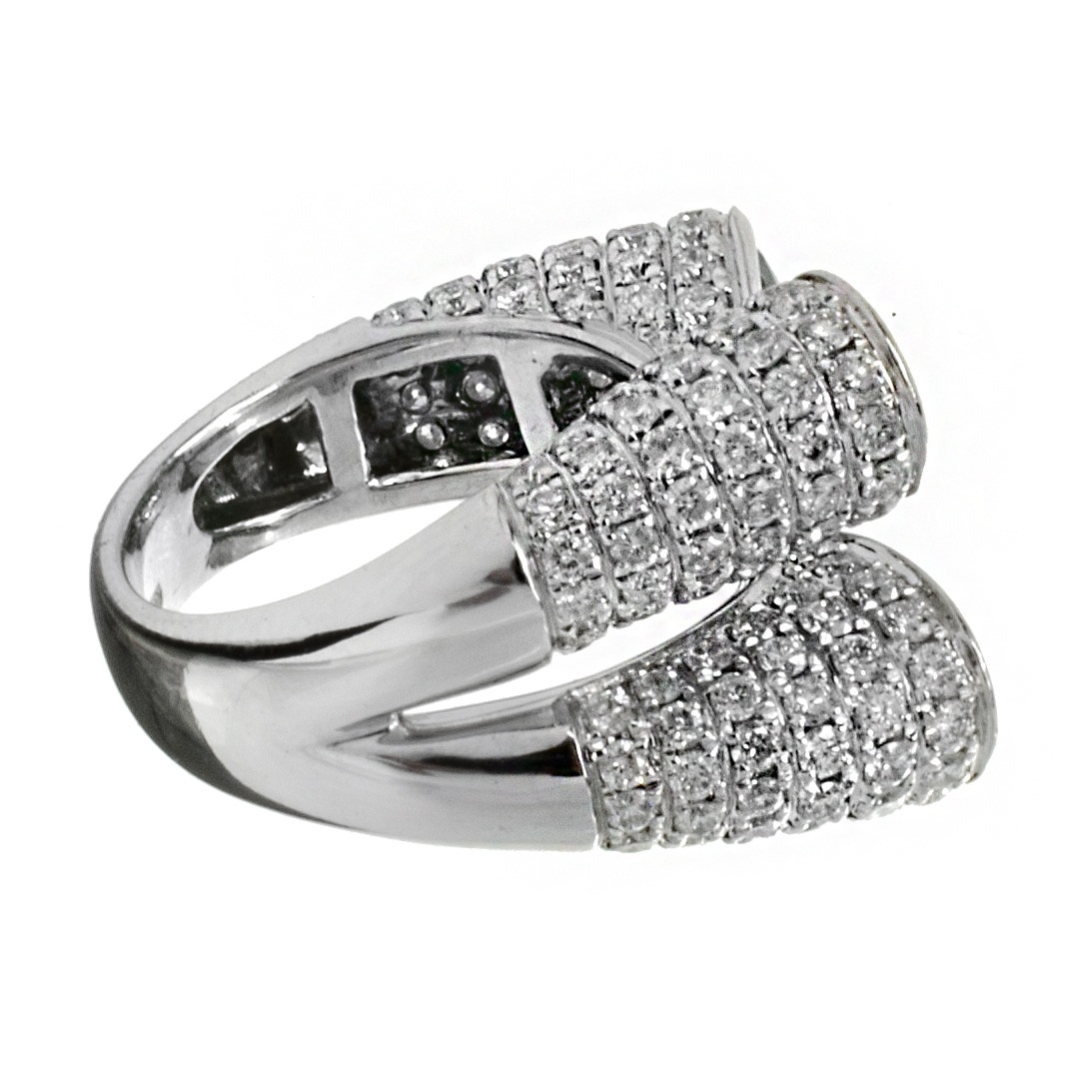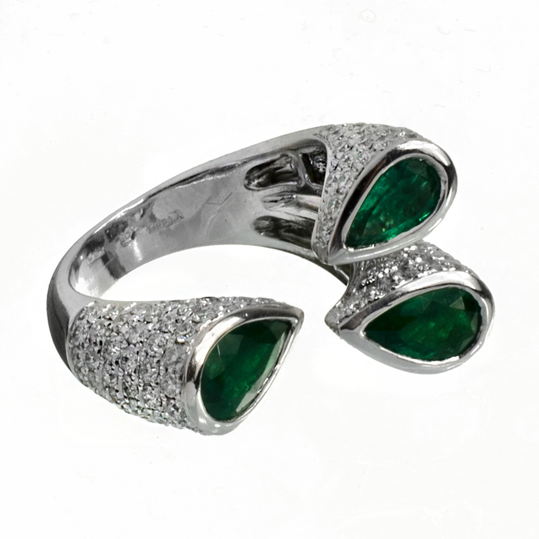 Atypický prsten z bílého zlata zdobený smaragdy a brilianty .