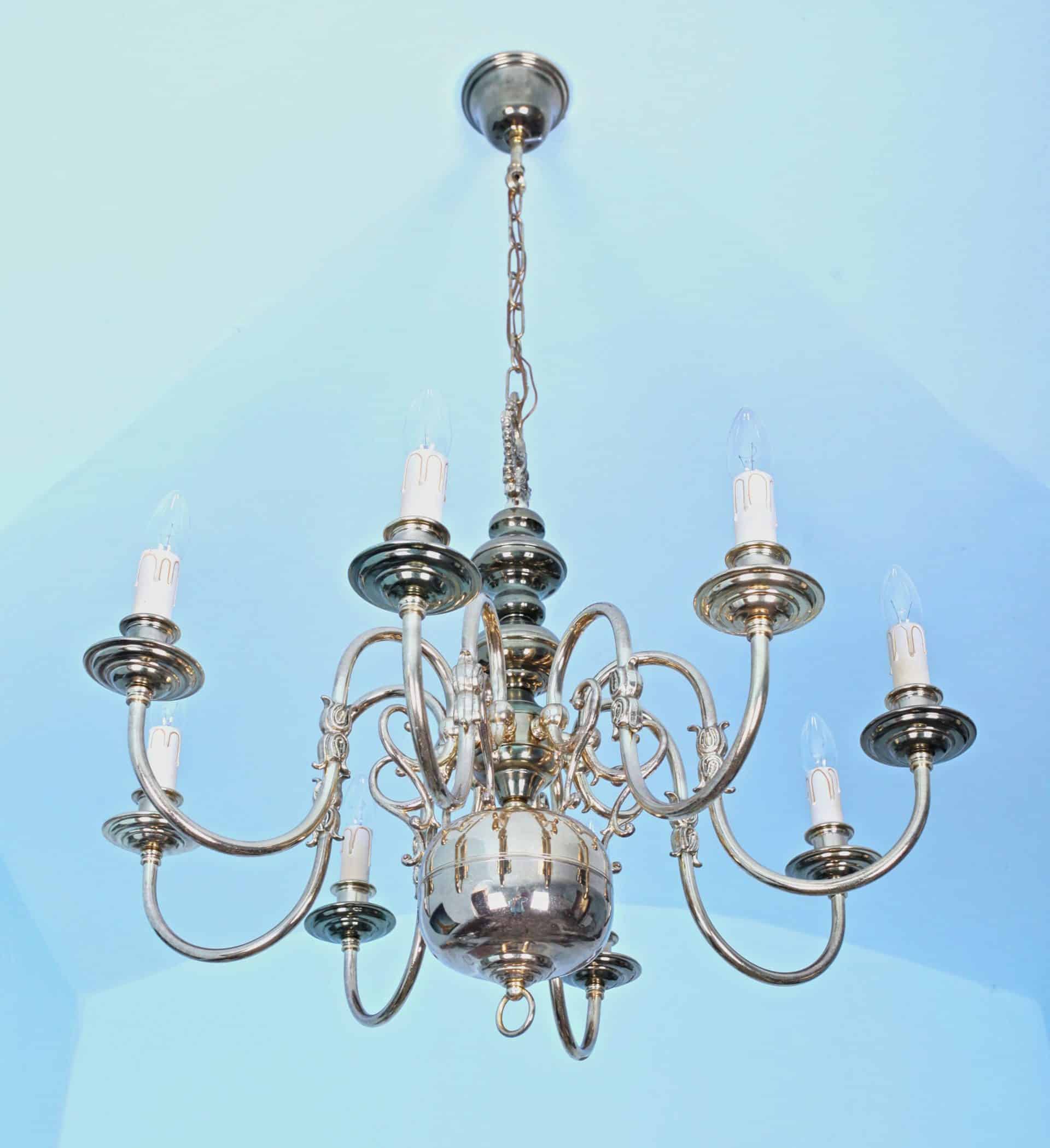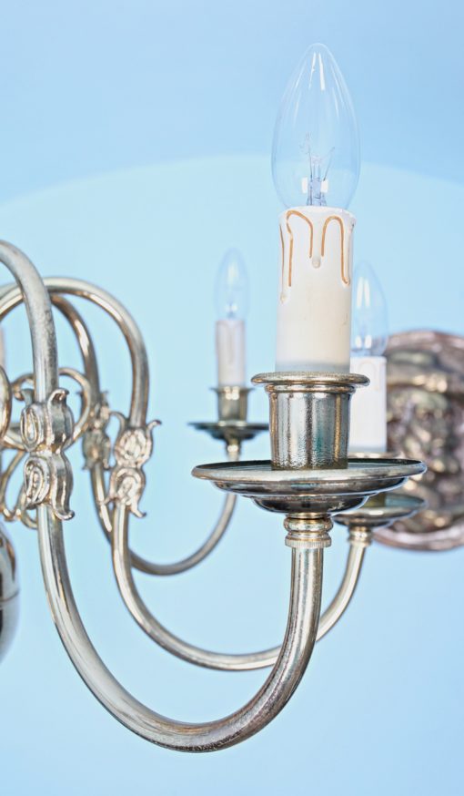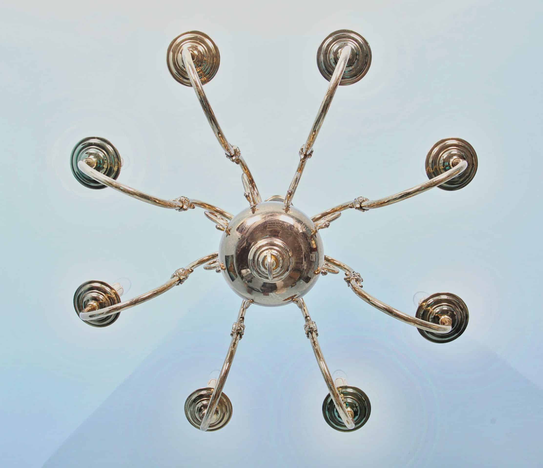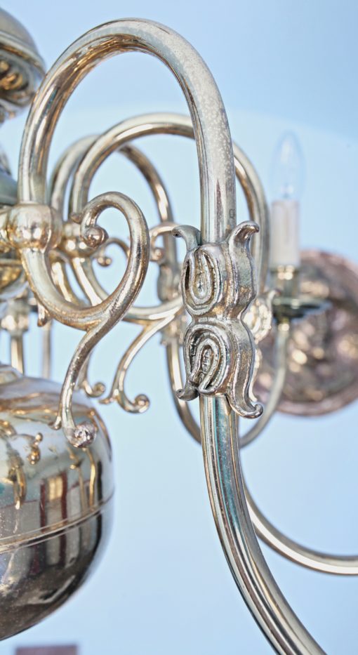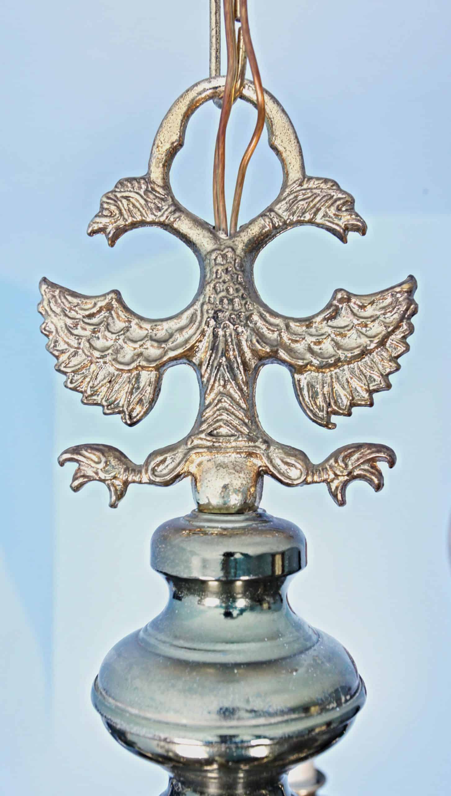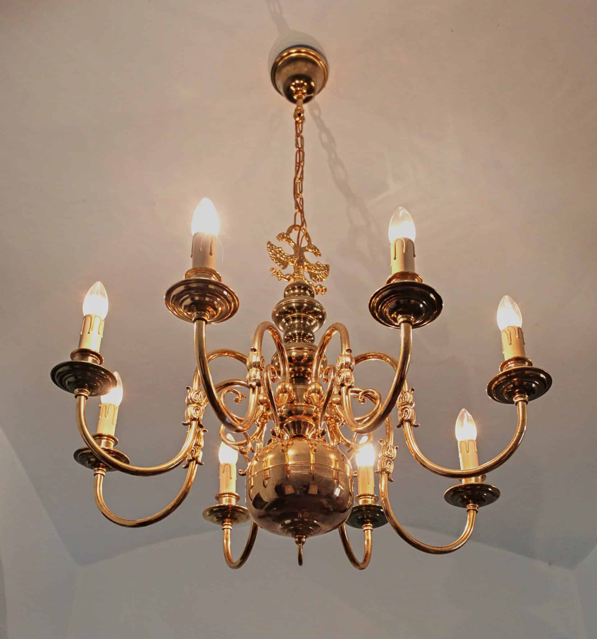 Krásný lustr z leštěné mosazi ve zlaté barvě. Vrchní část zdobená orlicí. Lustr je na osm klasických svíčkových žárovek se závitem E14 (vhodné jsou led i normální žárovky). Elektroinstalace je zánovní – lustr je plně funkční – ihned k užívání.