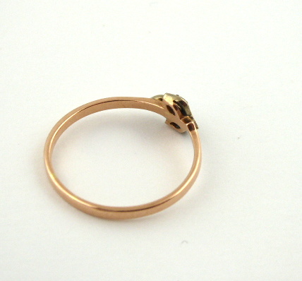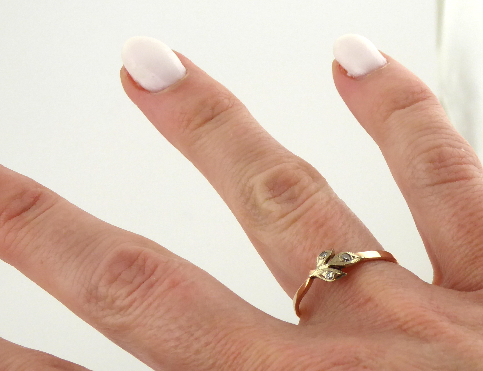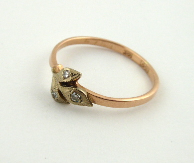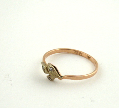 Čtrnáctikarátové zlato, přírodní diamanty. Ryzost Au 583/1000, celková hmotnost 1,70 g. Tři přírodní diamanty výbrusu achtkant o hmotnosti 0,05 ct. Přiloženo osvědčení Puncovního úřadu České republiky. Jemný zlatý prsten s hladkou obroučkou. Dekorován na hlavě prstenu motivem listů osázených přírodními diamanty. Značeno: ryzost, punc, značka výrobce. Sovětský svaz 1958 – 1992.