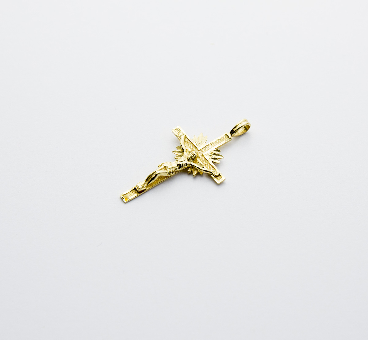 zlatý kříž s velmi povedeným detailním zobrazením Ježíše Krista, paprsky vyzařující zpoza kříže symbolizují vítězství nad smrtí, Au 1,91 g/585/1000, Západní Evropa, kolem r. 1995, puncováno, rozměry 3,8 x 2 cm
