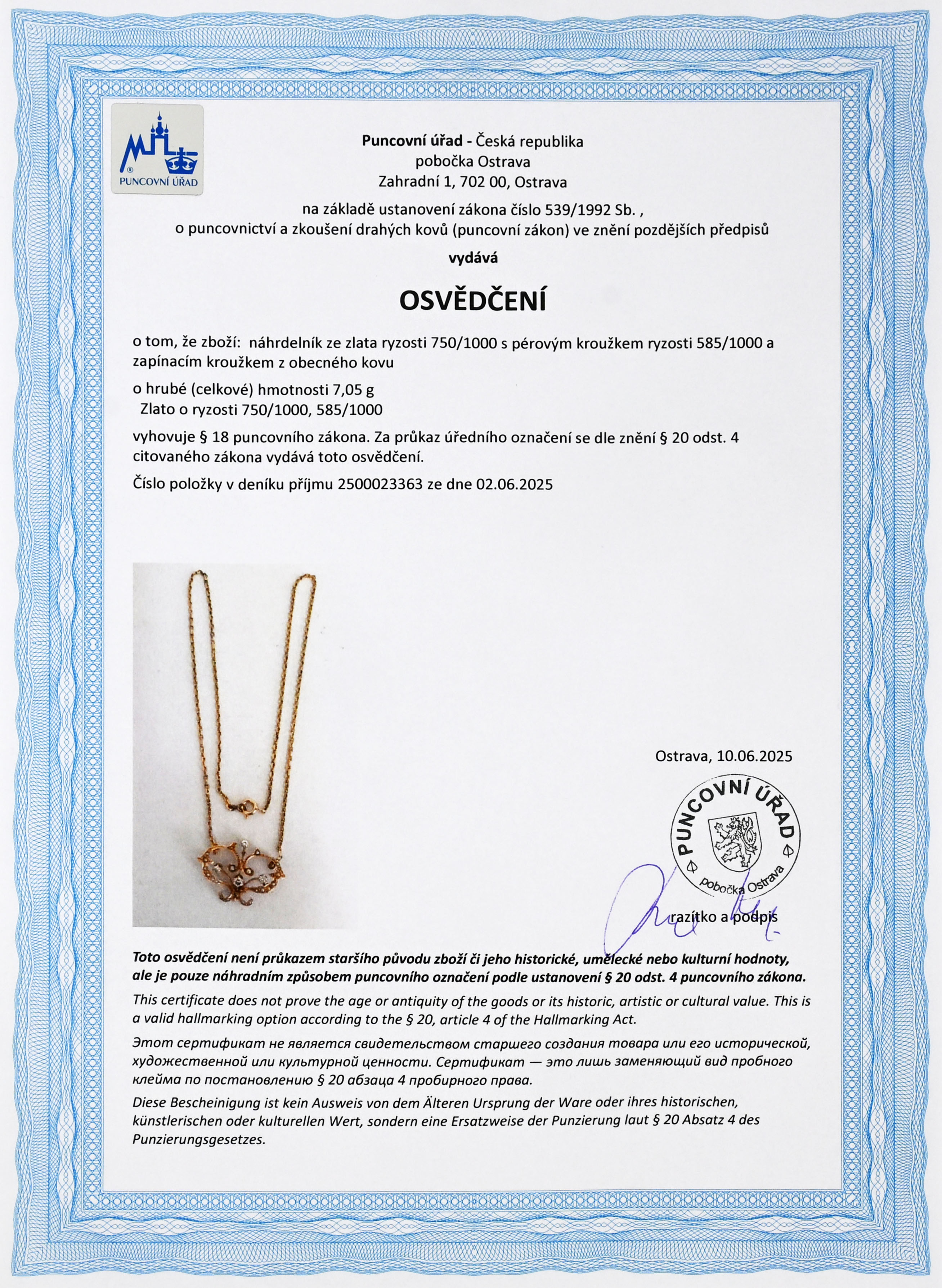 osvědčení puncovního úřadu
