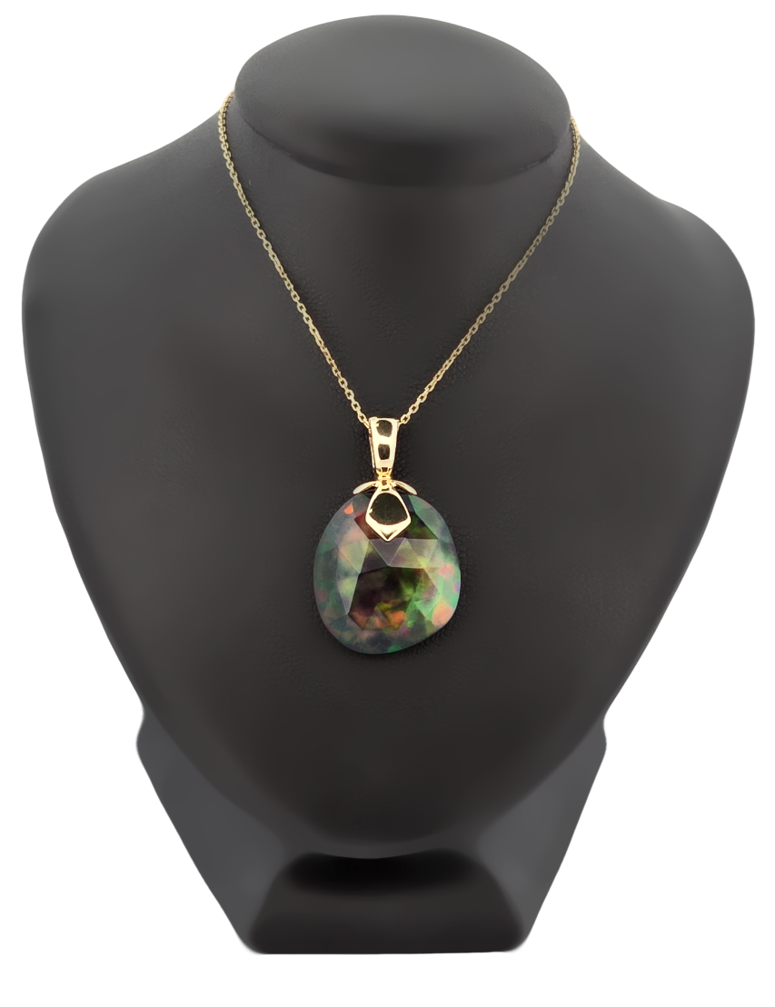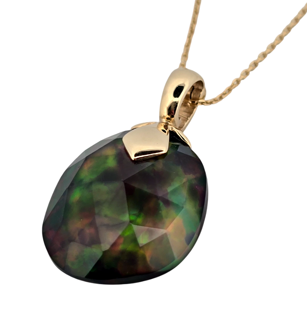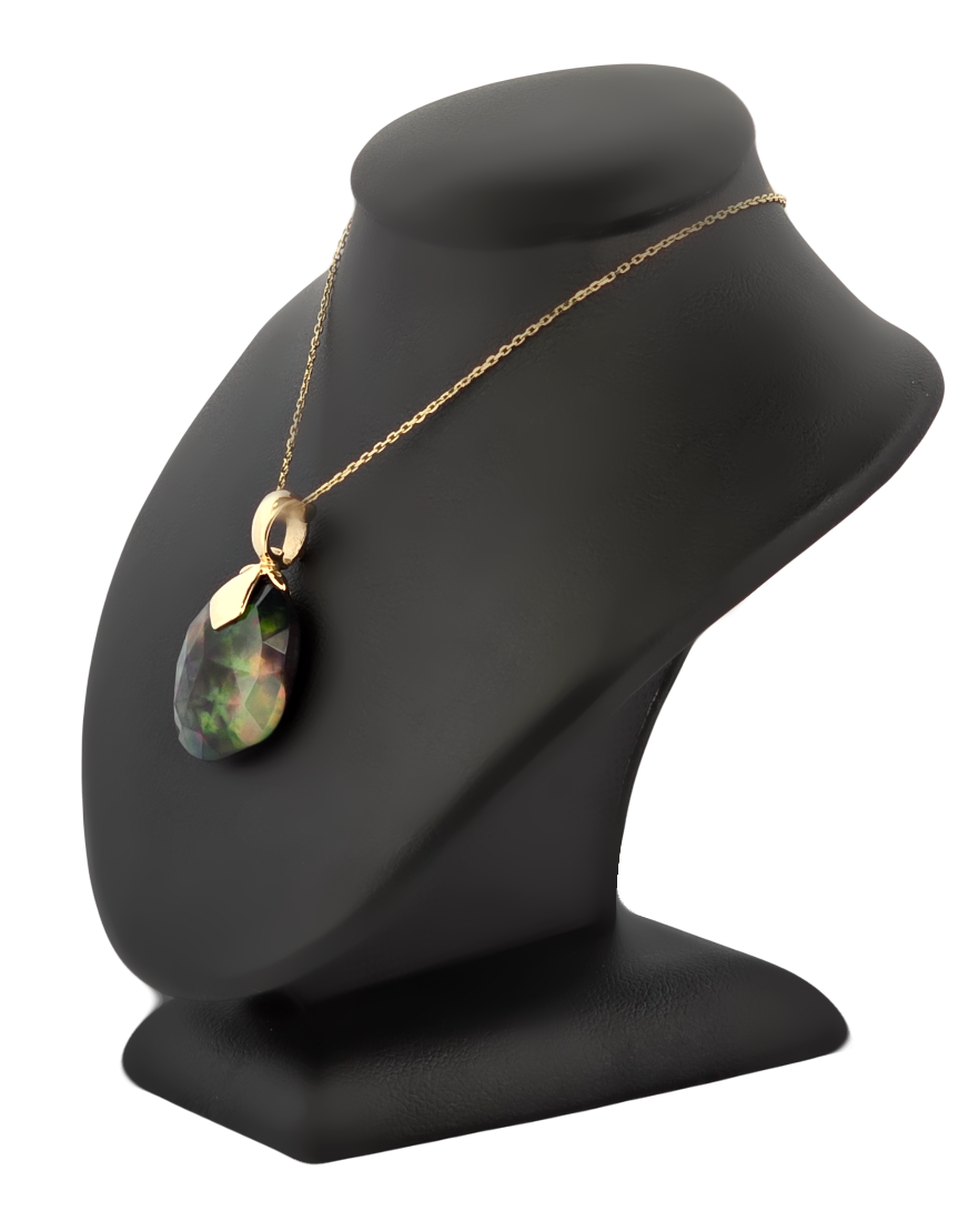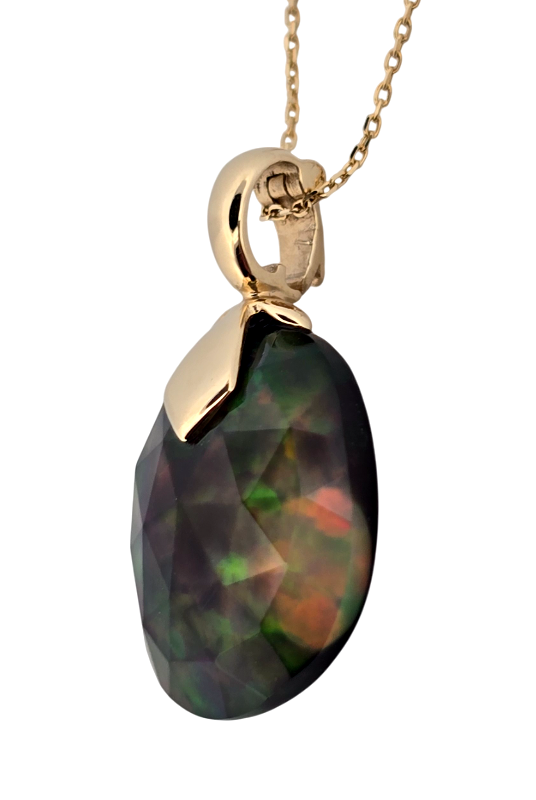Popis: Zlatý luxusní přívěs s řetízkem. Jedná se o přírodní etiopský opál, nádherně fazetovaný – vybroušené plošky výrazně opaleskují duhovými barvami. Zadní černá strana dobarvovaná chemických procesem. Otevíratelné očko, drží pevně. Zapínání řetízku klasické.