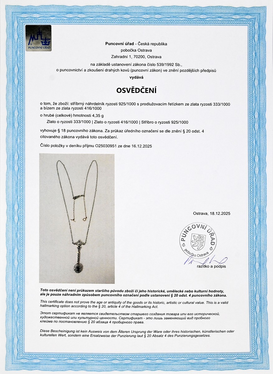 – osvědčení Puncovního úřadu České republiky