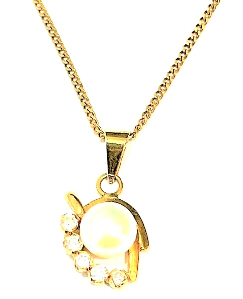 Souprava zlatého přívěšku s bílými kamínky a říční perličkou ze 14 karátového žlutého zlata AU 585/1000 a řetízku ze žlutého zlata 14 karátů AU 585/000, váha šperku komplet 4,76 gramů brutto