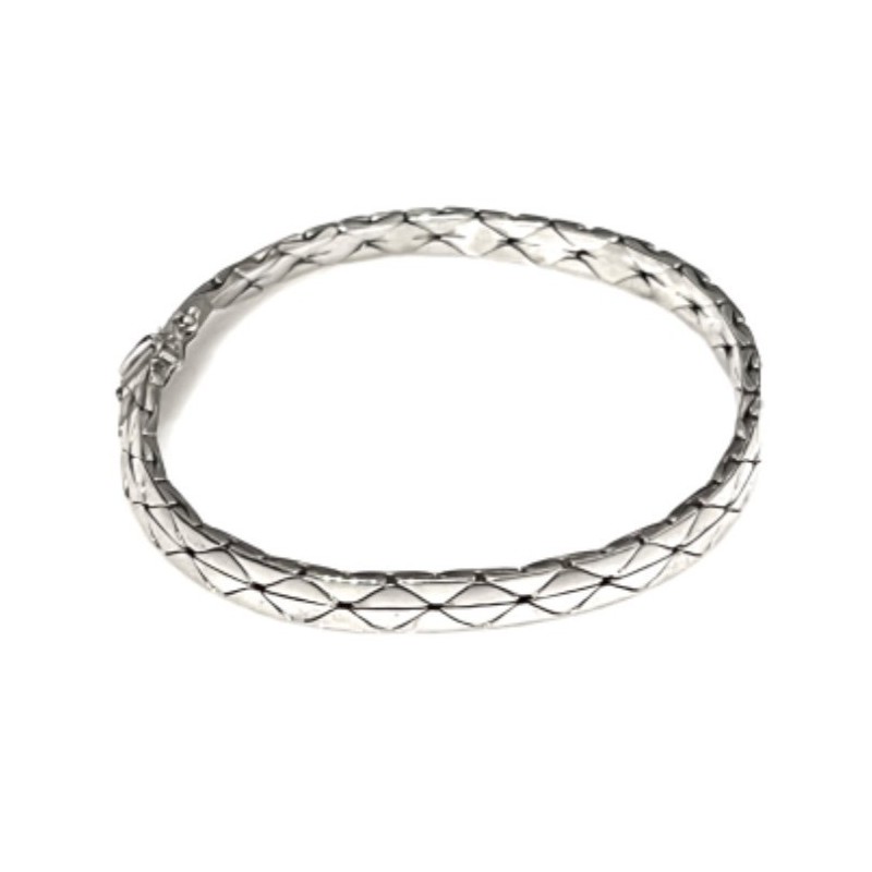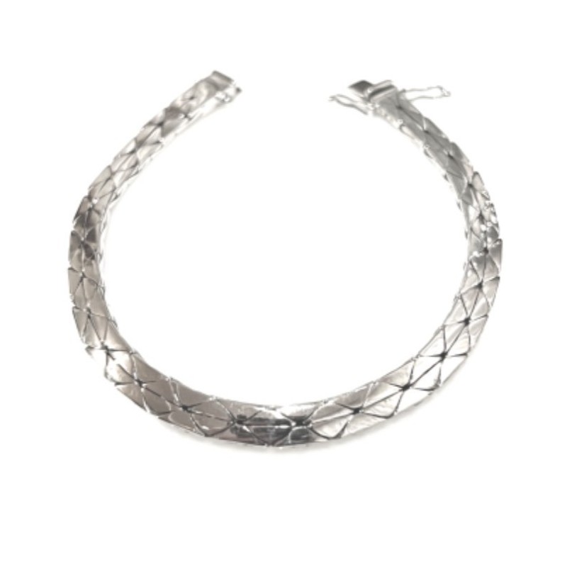 Masivní zlatý náramek vyrobený z bílého 18 karátového zlata = ryzost AU 750/1000 v lesklé povrchové úpravě se zapínáním na bezpečnostní zámeček doplněný dvěma bočníma pojistkami. Šířka náramku cca 5 mm. Délka zlatého náramku je 18 cm. Váha je 19,210 gramů.