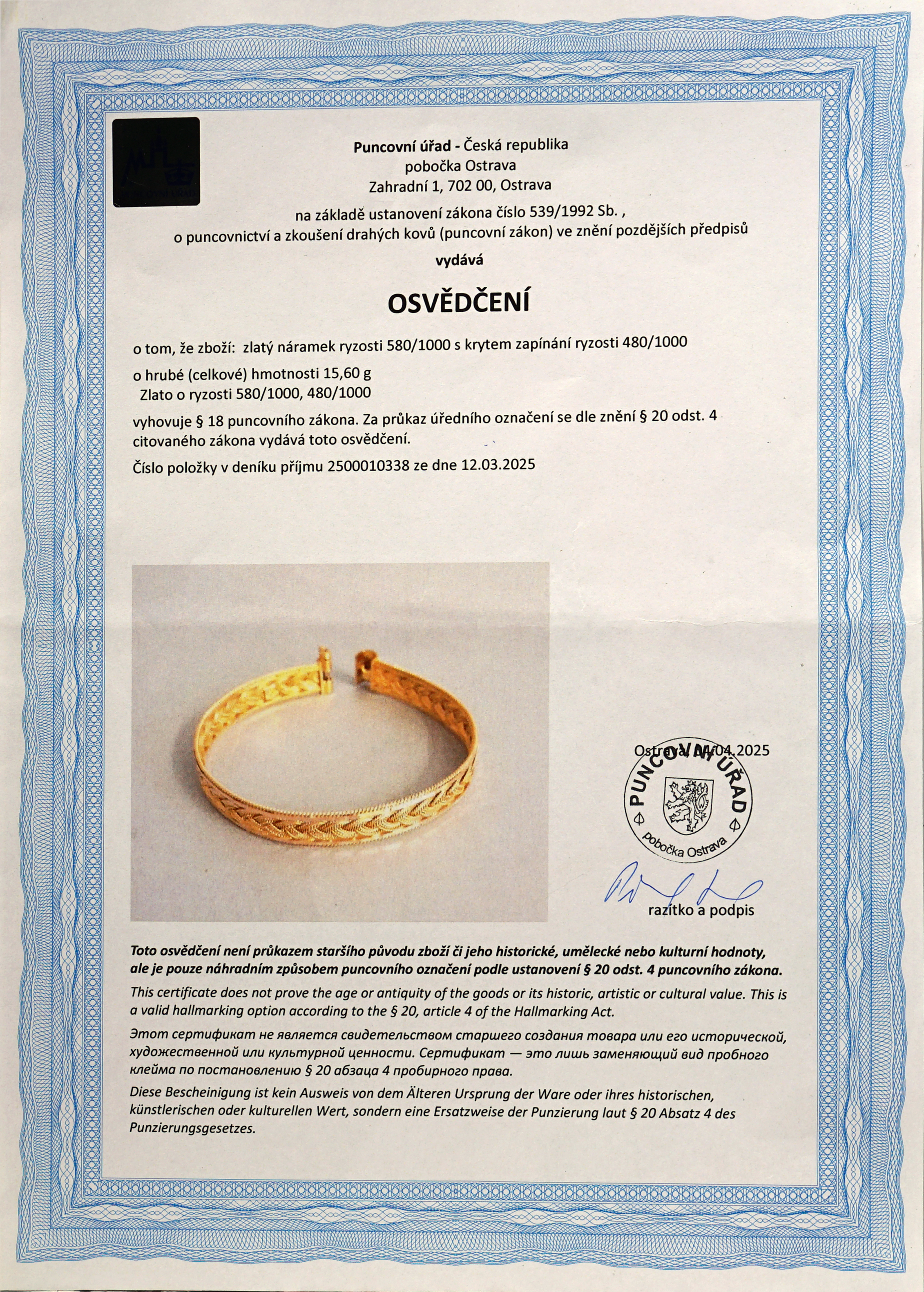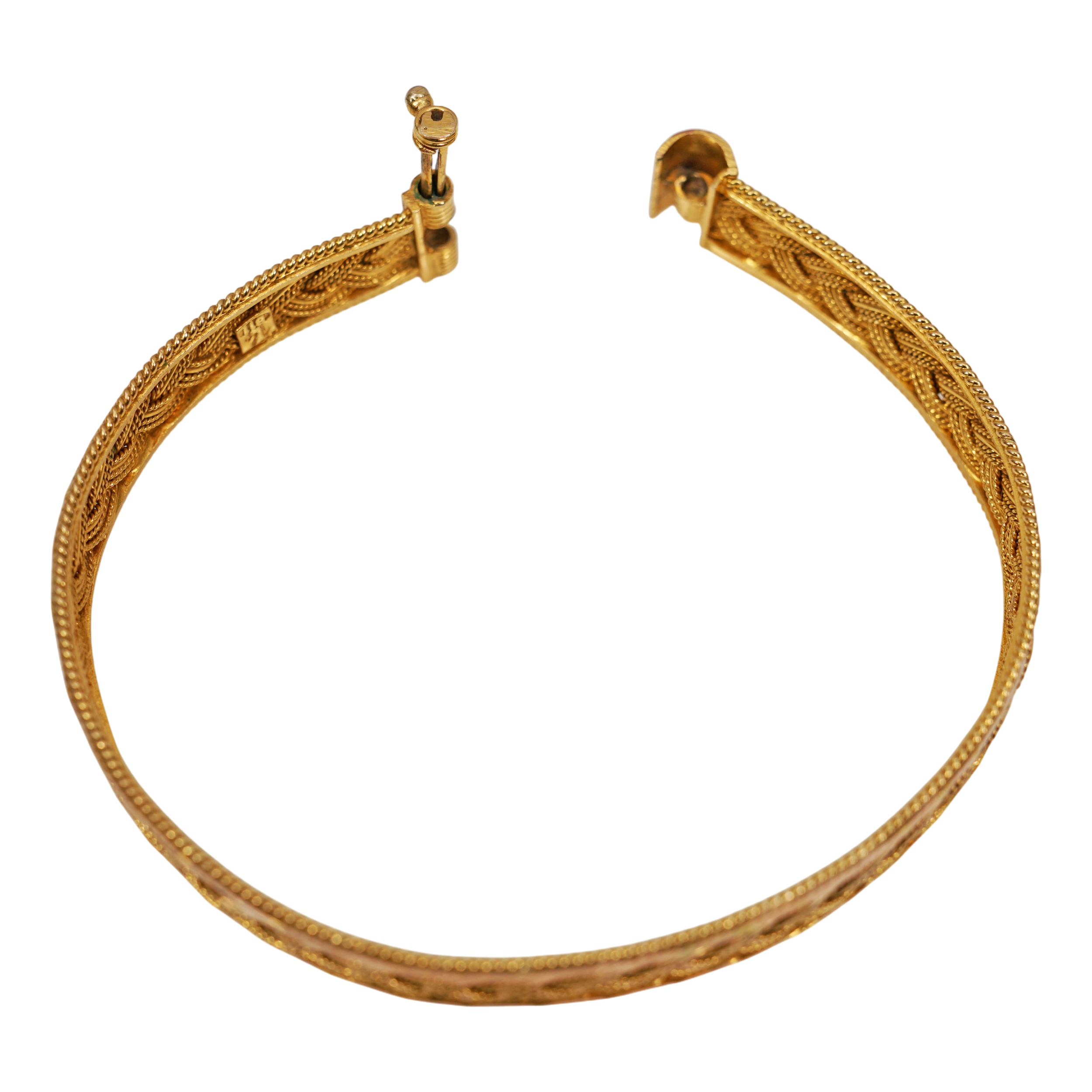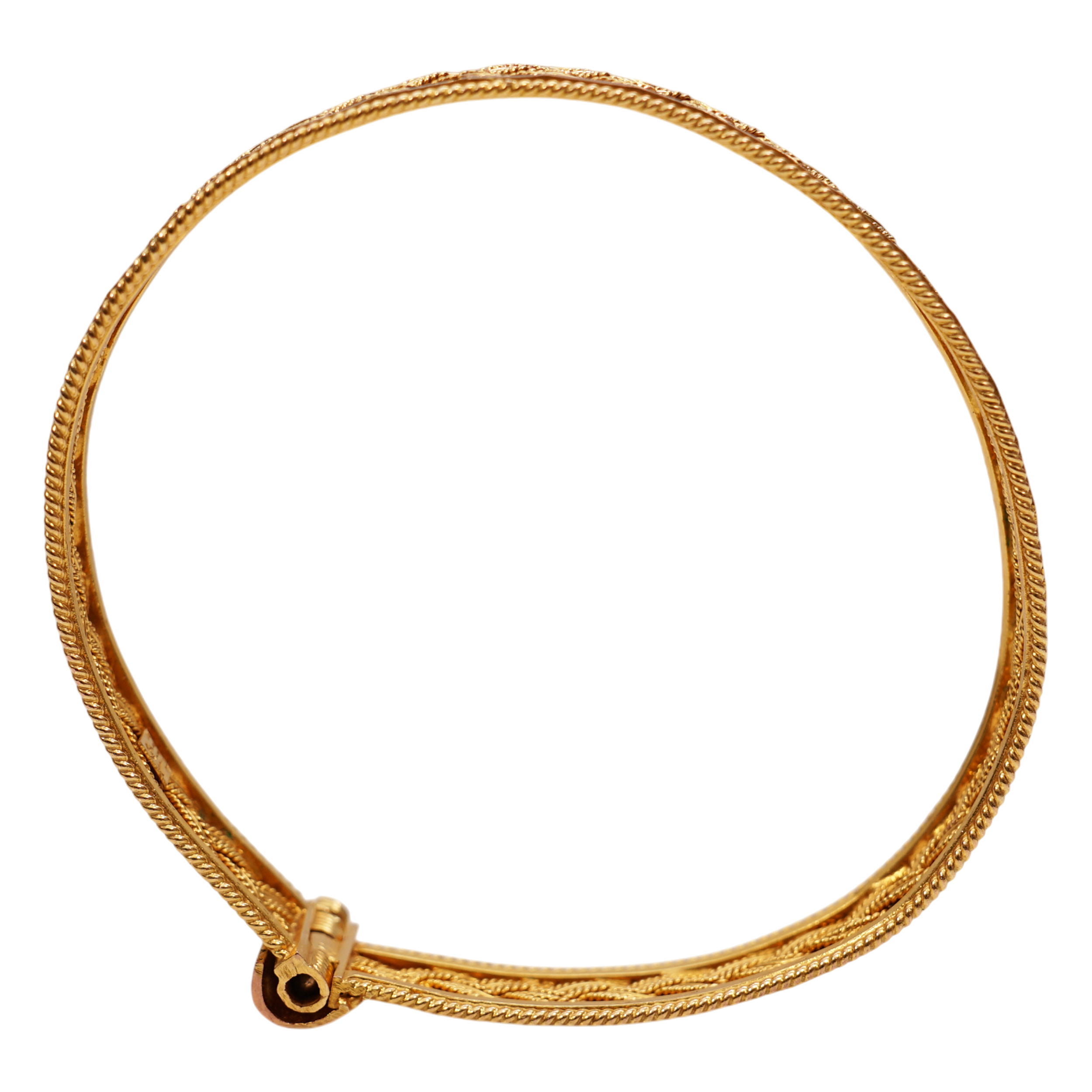 Zlatý náramek z období první republiky. Váha 15,60 g / 585. Nepoškozeno. Průměr 5,4 x 5,7 cm.