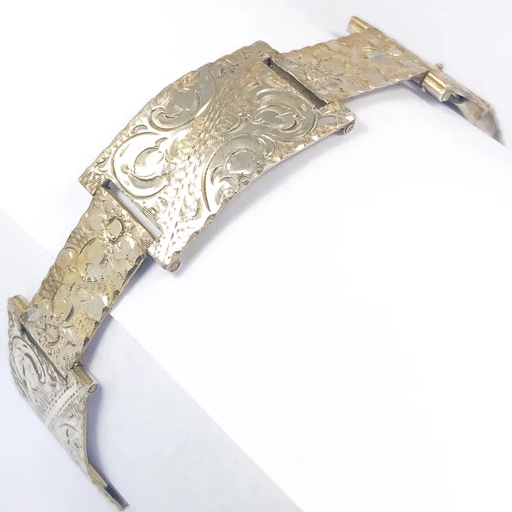 Zhotoveno z bílého 14 karátového zlata, tj. o ryzosti 585/1000; nově opatřeno puncem Z-58 (labuť 4), ryzostní číslo a mistrovskou značkou na zapínání. Hmotnost 11,23 g, délka 14,8 cm, čímž je pro subtilnější zápěstí, délka ozdobné části 77 mm. Jazýčkové zapínání v pořádku, včetně dvou „8“ pojistek. Ve velmi zachovalém stavu, odborně vyčištěno a vyleštěno zlatníkem. Součástí odborný posudek.