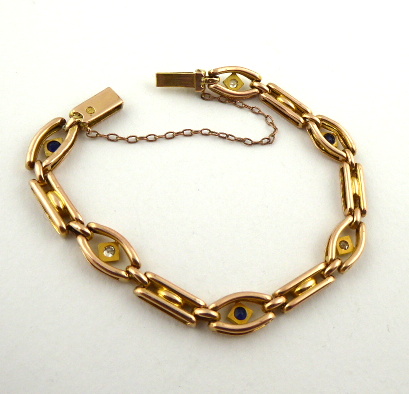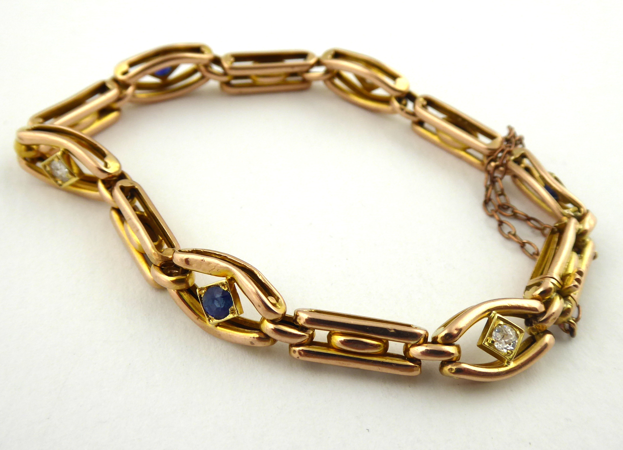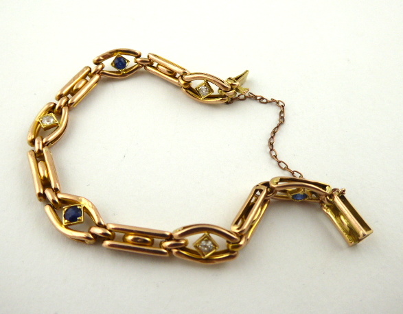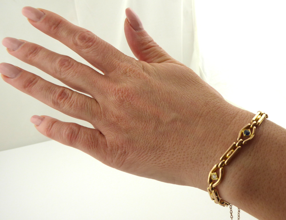 Čtrnáctikarátové zlato, přírodní safíry a přírodní diamanty. Ryzost Au 585/1000, celková hmotnost 8,40 g. Velmi působivý zlatý článkový náramek na drobnější dámské zápěstí se třemi přírodními diamanty starého briliantového brusu o celkové váze 0,25 ct, barva G, čistota P doplněnými o tři články s třemi přírodními ručně broušenými safíry modře syté barevnosti. Náramek je ve výborném stavu a má bezpečnostní pojistku na zavírání. Nově označeno platným českým puncem labuť. Evropa 1900 – 1920. Délka 90 mm.