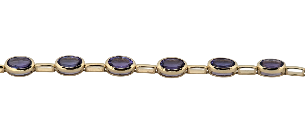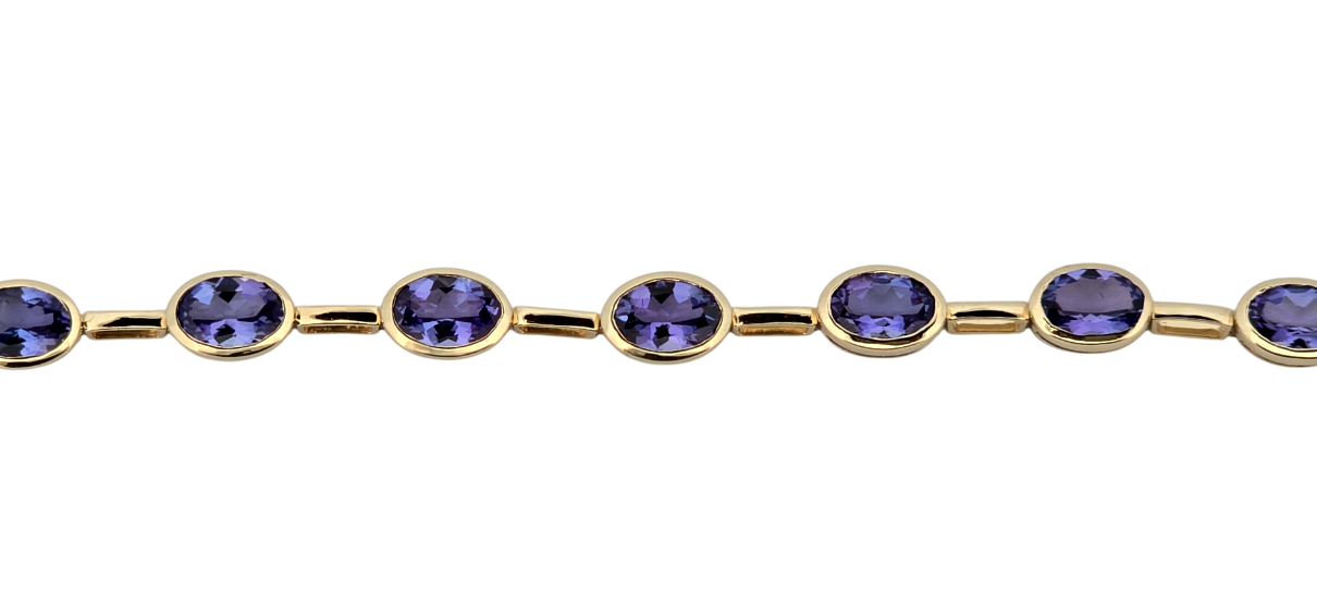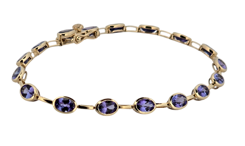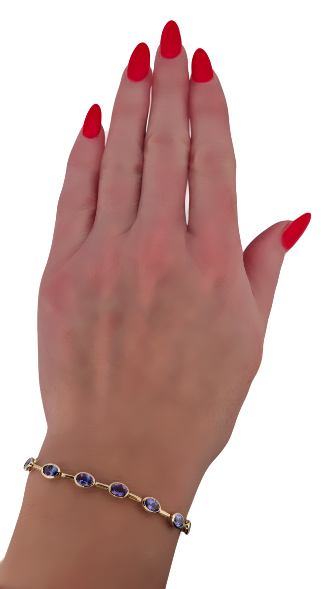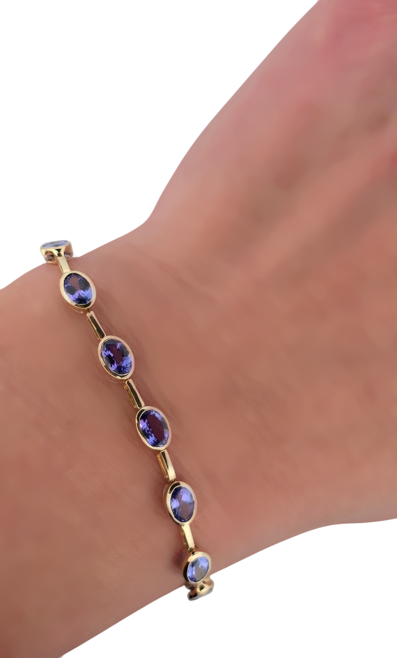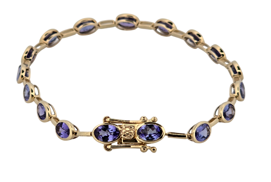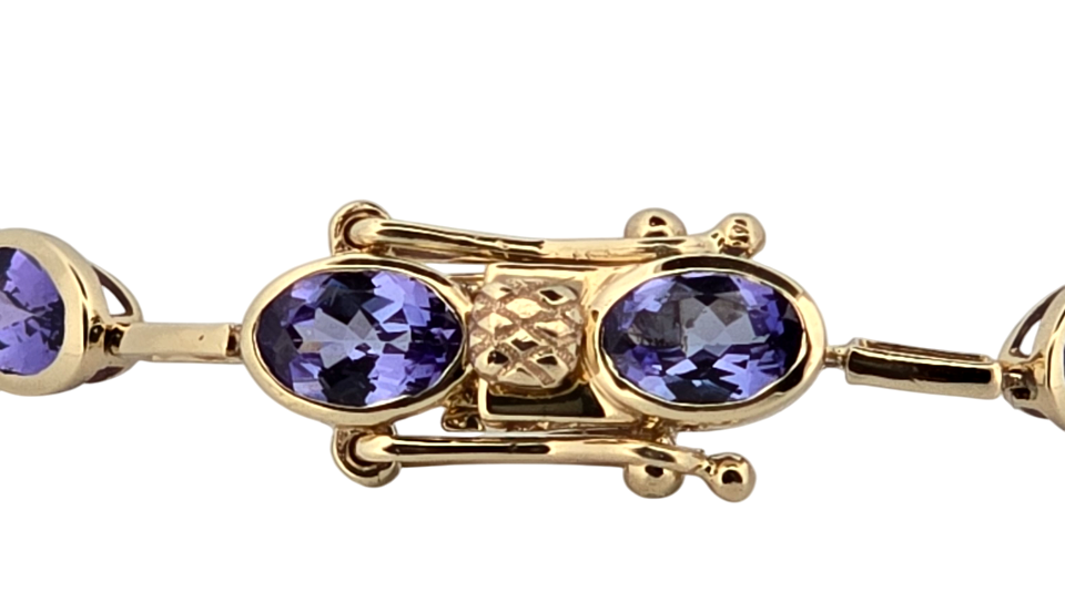 Popis: Luxusní zlatý náramek s přírodními tanzanity. Tanzanity díky své jedinečnosti vzrůstají enormně na hodnotě. Vynikají svojí jasnou modro fialovou barvou. Na náramku je celkem 17 kusů přírodních tanzanitů smíšeného brusu, kvality velmi dobré dobré, o celkové váze cca 6,8 ct. Náramek má dvojité bezpečnostní zapínání. Jedná se o luxusní šperk, velmi výjimečný a vhodný také jako investice.