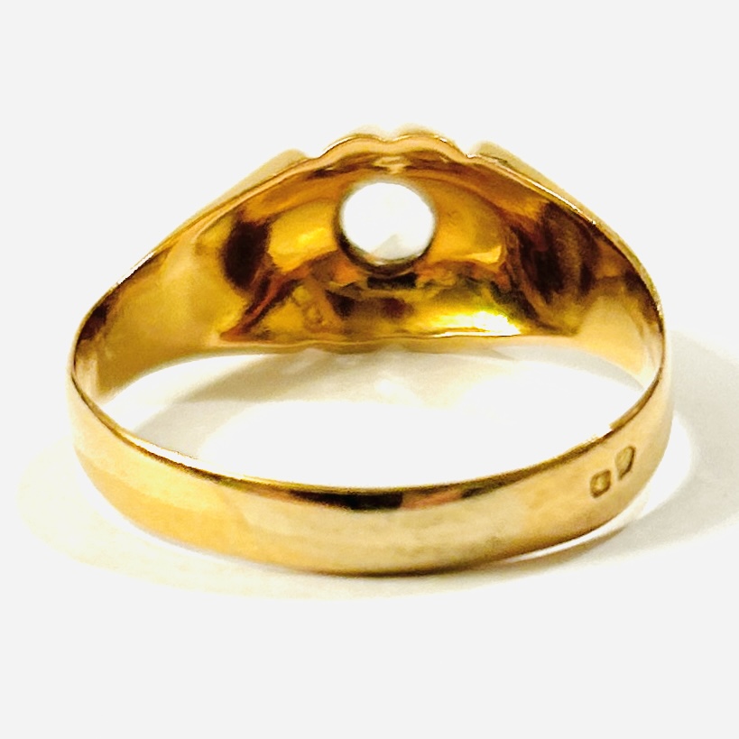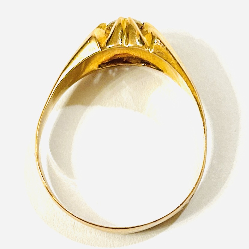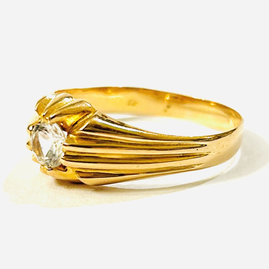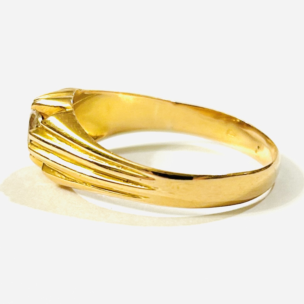 Elegantní prsten osazený čirým kamenem kulatého brusu, uloženo v protažené paprskově pojaté hlavici s lineárními rýhami do poloviny šíny. Portugalská zlatnická práce z 2. třetiny 20. století.