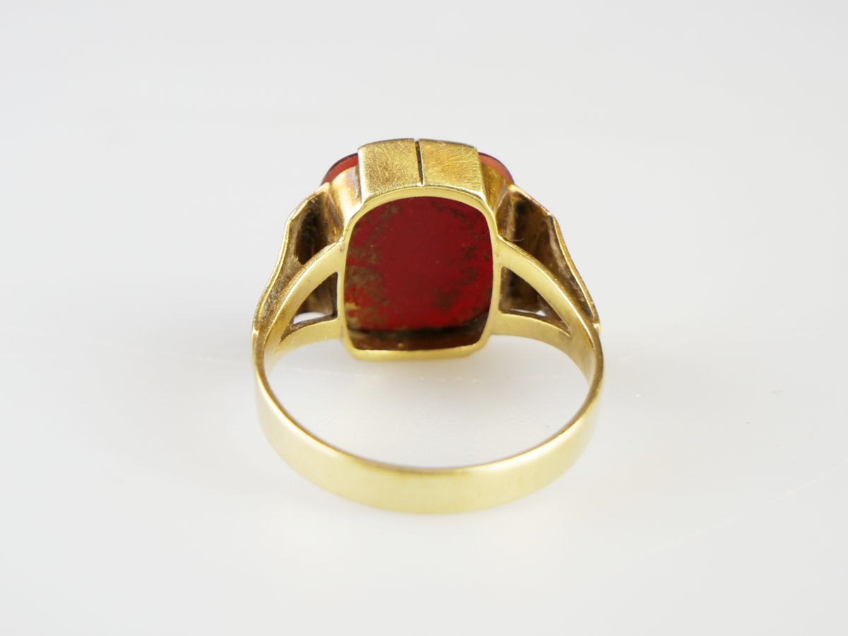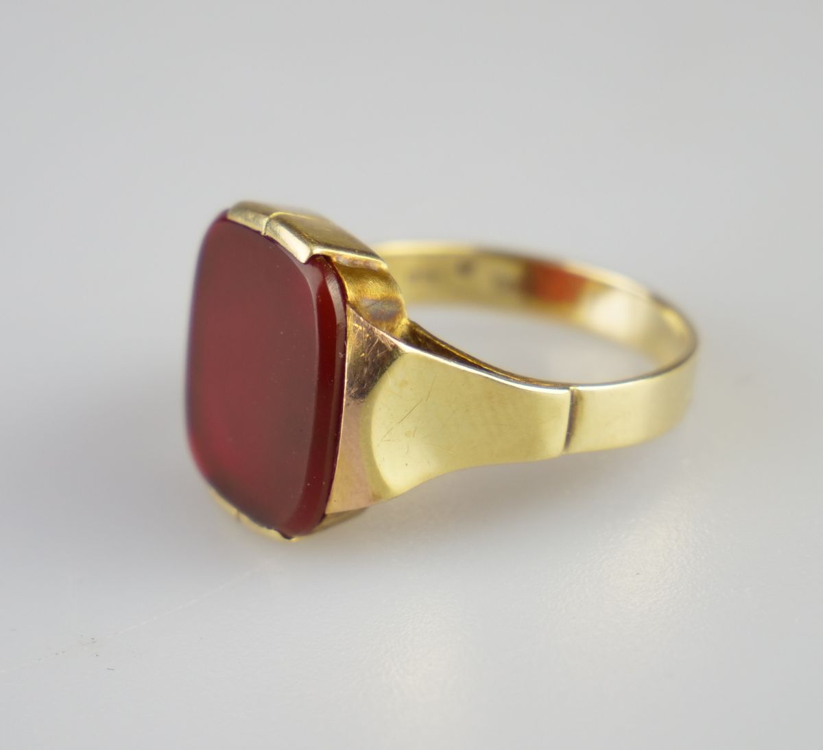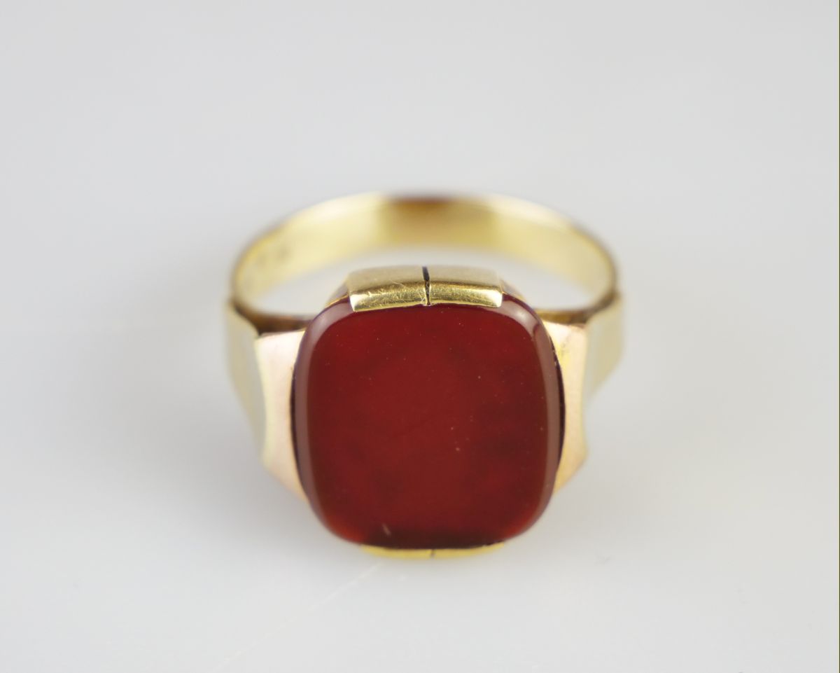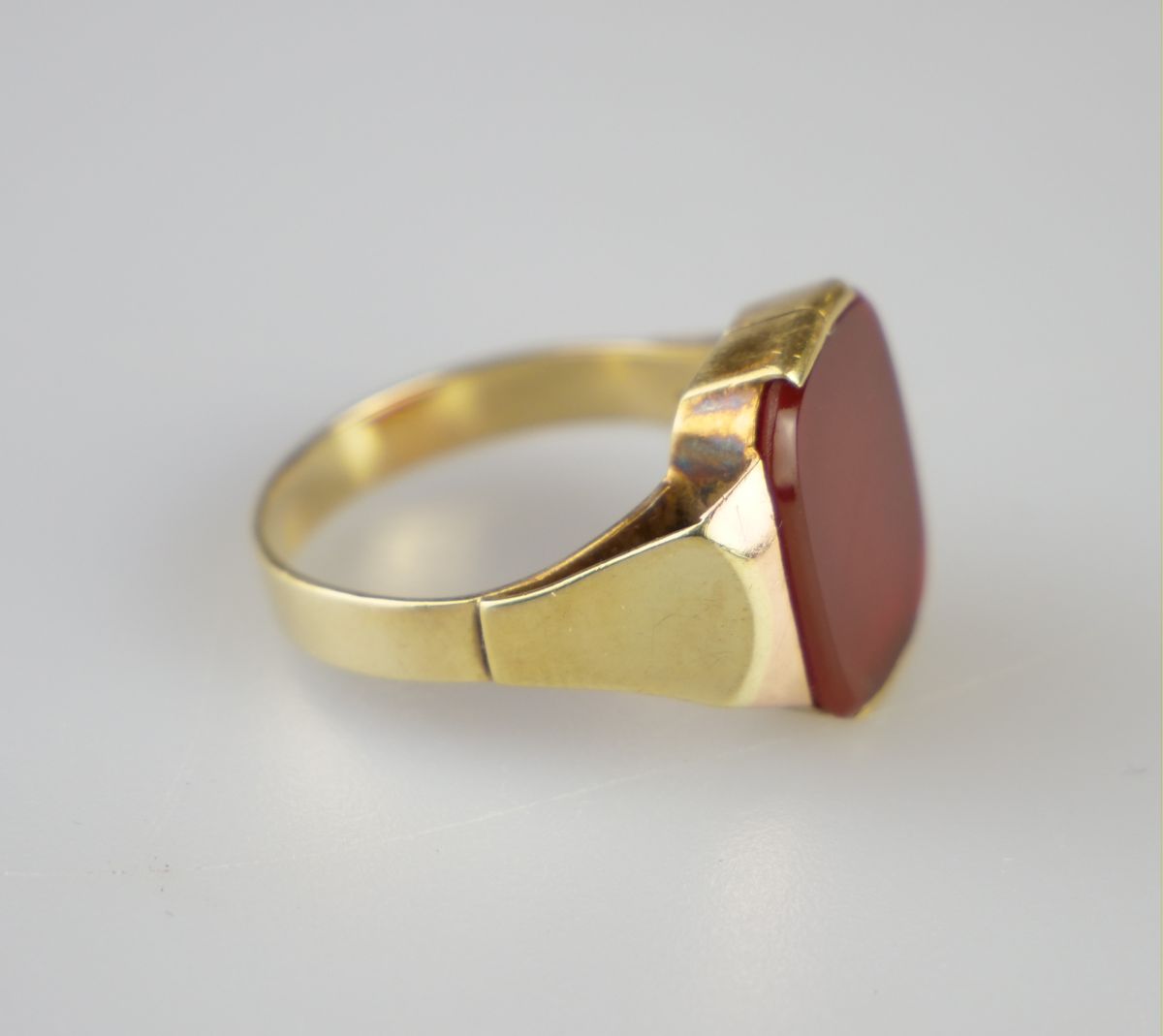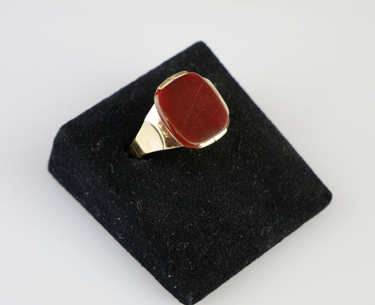 zlatý pánský prsten s karneolem, Au btto 5,27 g/585/1000, Československo, kolem r. 1965, dobový punc (čejka); velikost prstenu 60