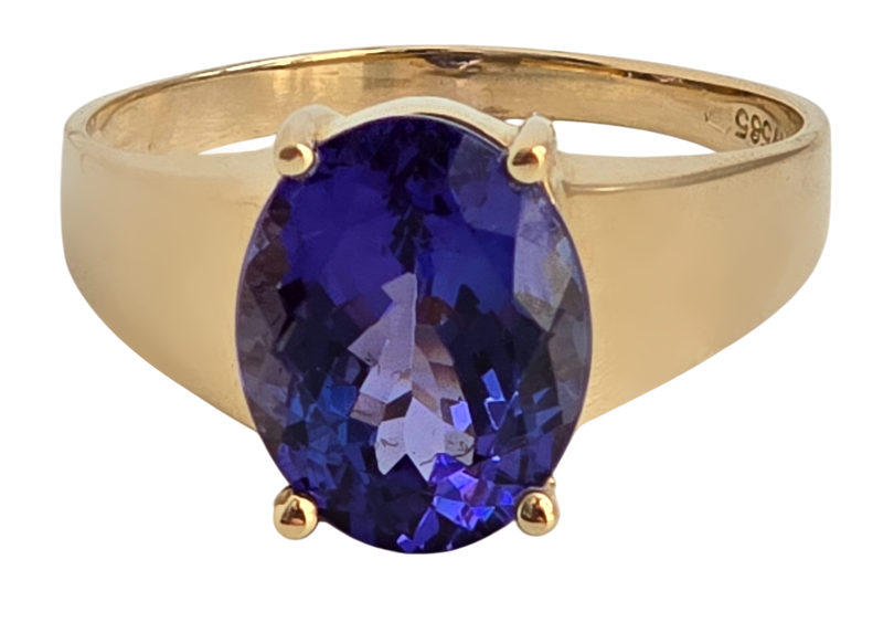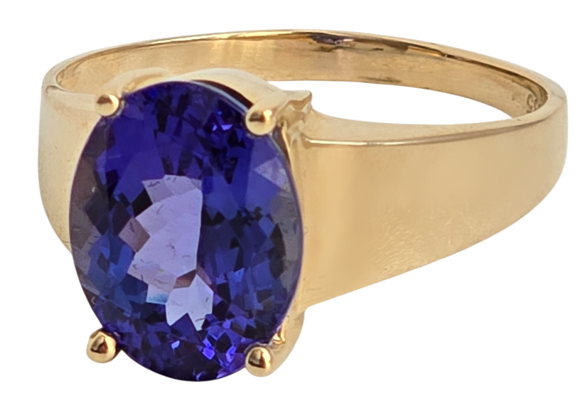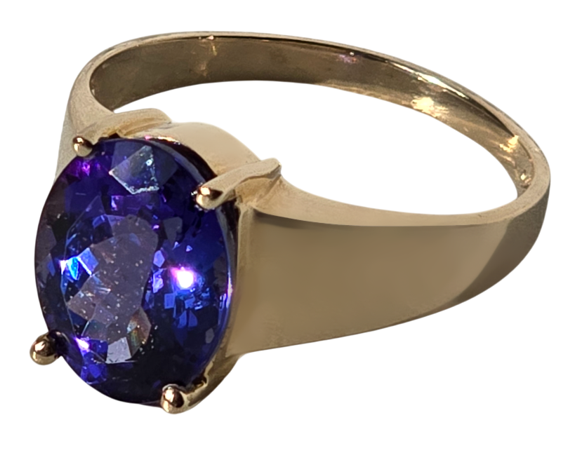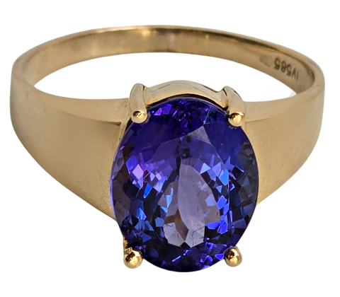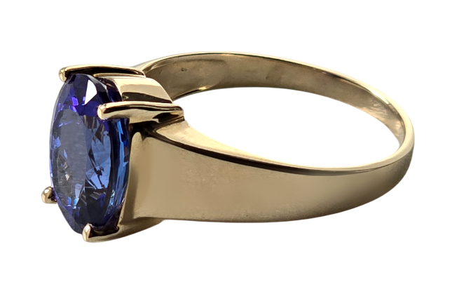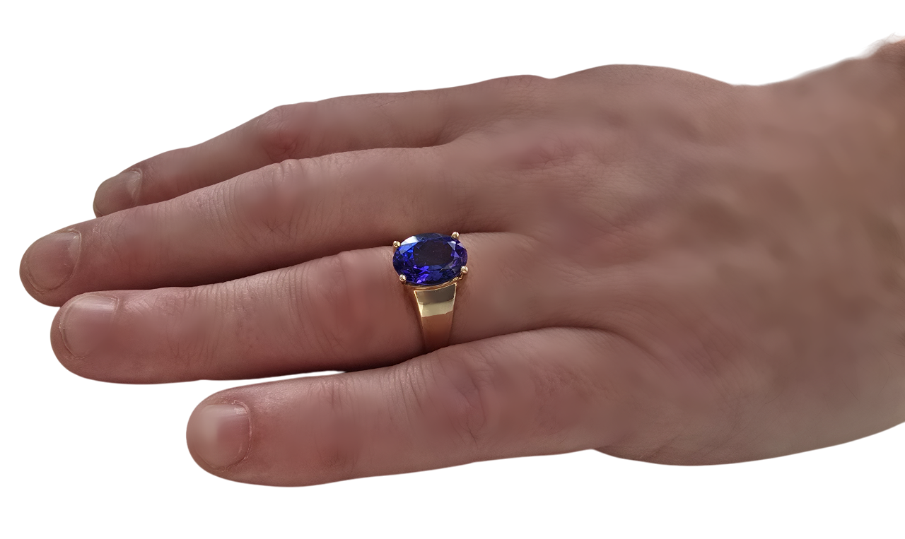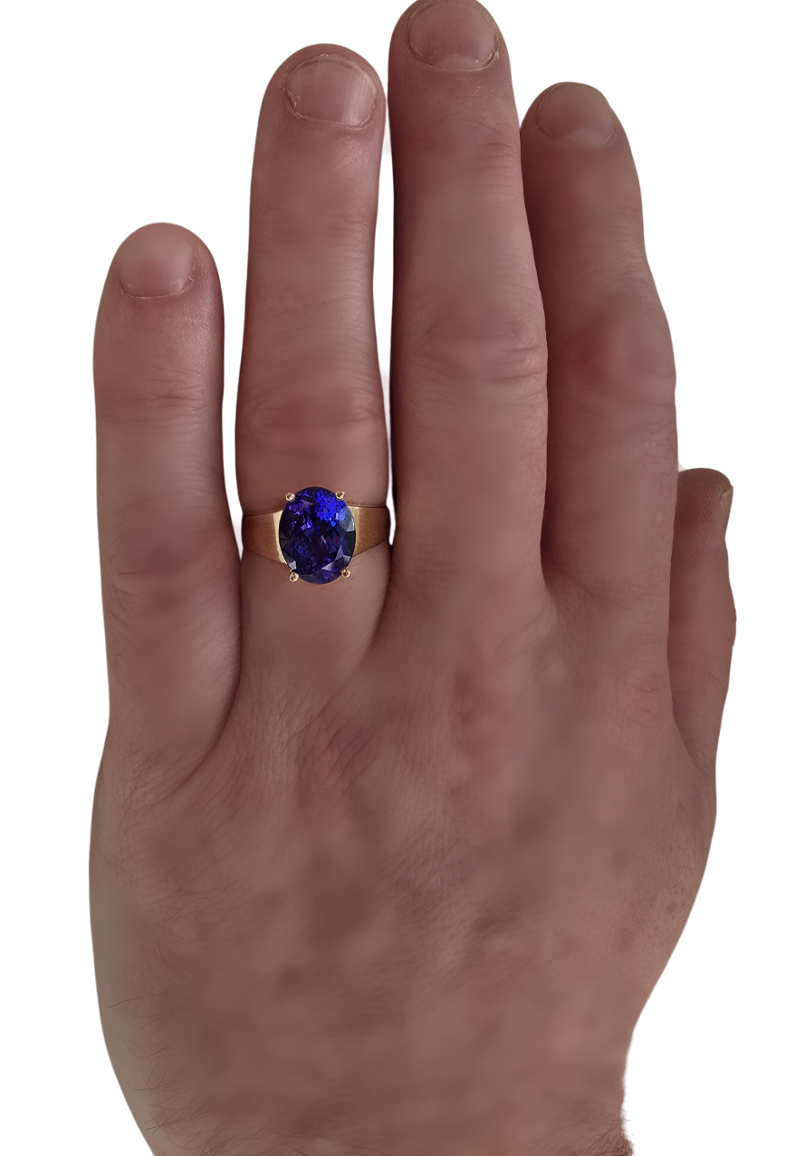 Luxusní zlatý pánský prsten robustního vzhledu s přírodním velikým tanzanitem překrásné sytě modré barvy s typickým fialovým pleochroismem. V prstenu je vsazen oválný přírodní tanzanit portugaského brusu, velmi dobré kvality, o váze 5,6 ct. Velikost kamene je 12,5 x 9,8 x 6,61 mm. Na vnější straně prstenu signace IV – jedná se o prsten z dílny Harry Ivens. Jednoduchý elegantní design s dominantním tanzanitem výborné kvality. TOP stav. Velikost 65. Ryzost: 585/1000. Váha: 5,57 g.