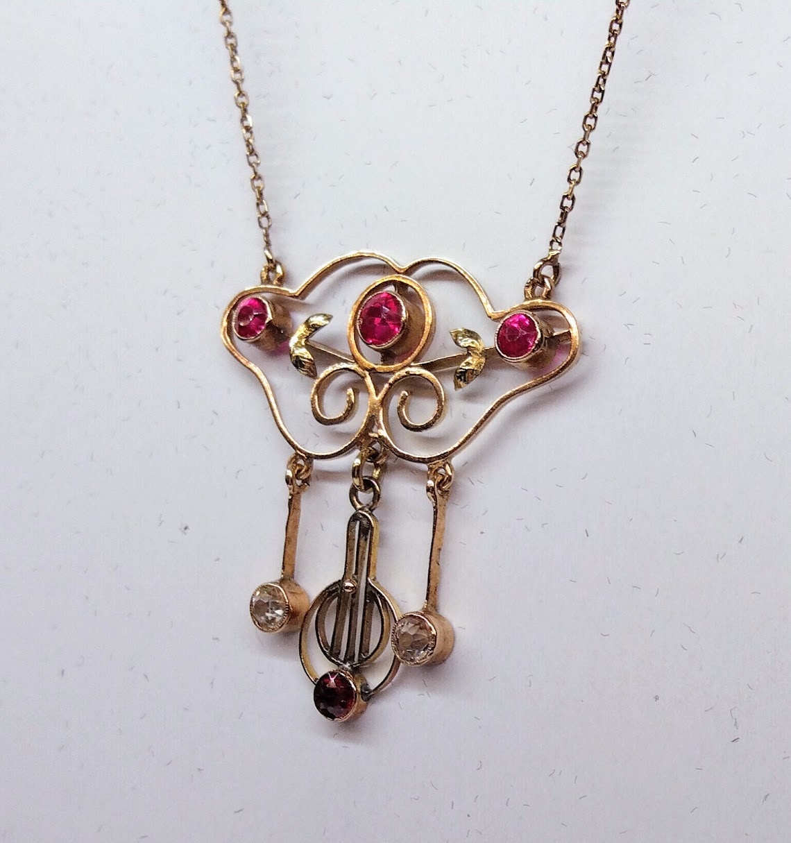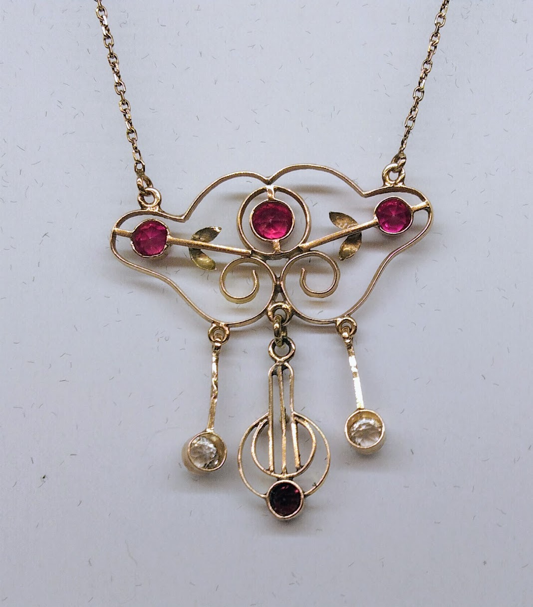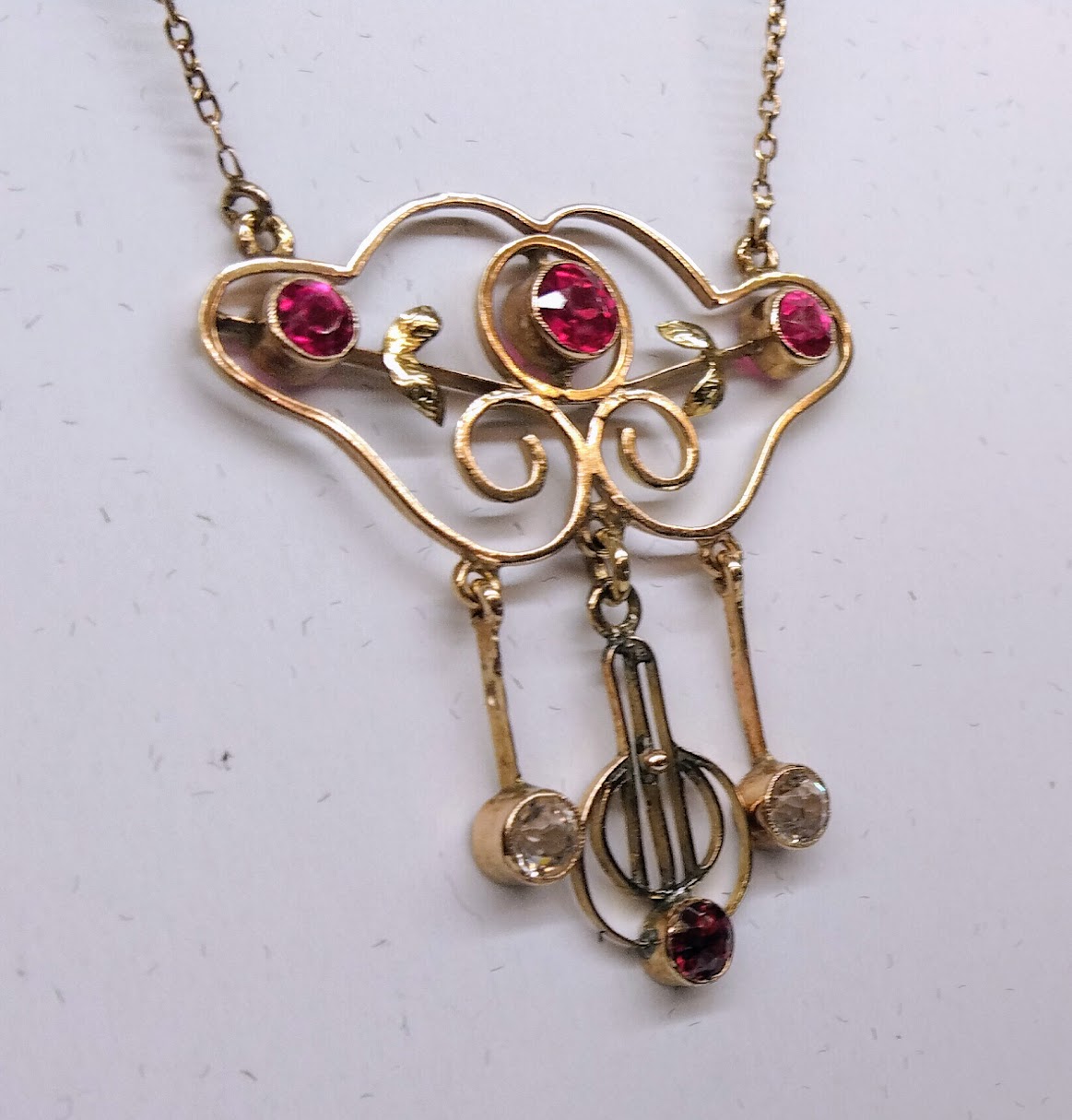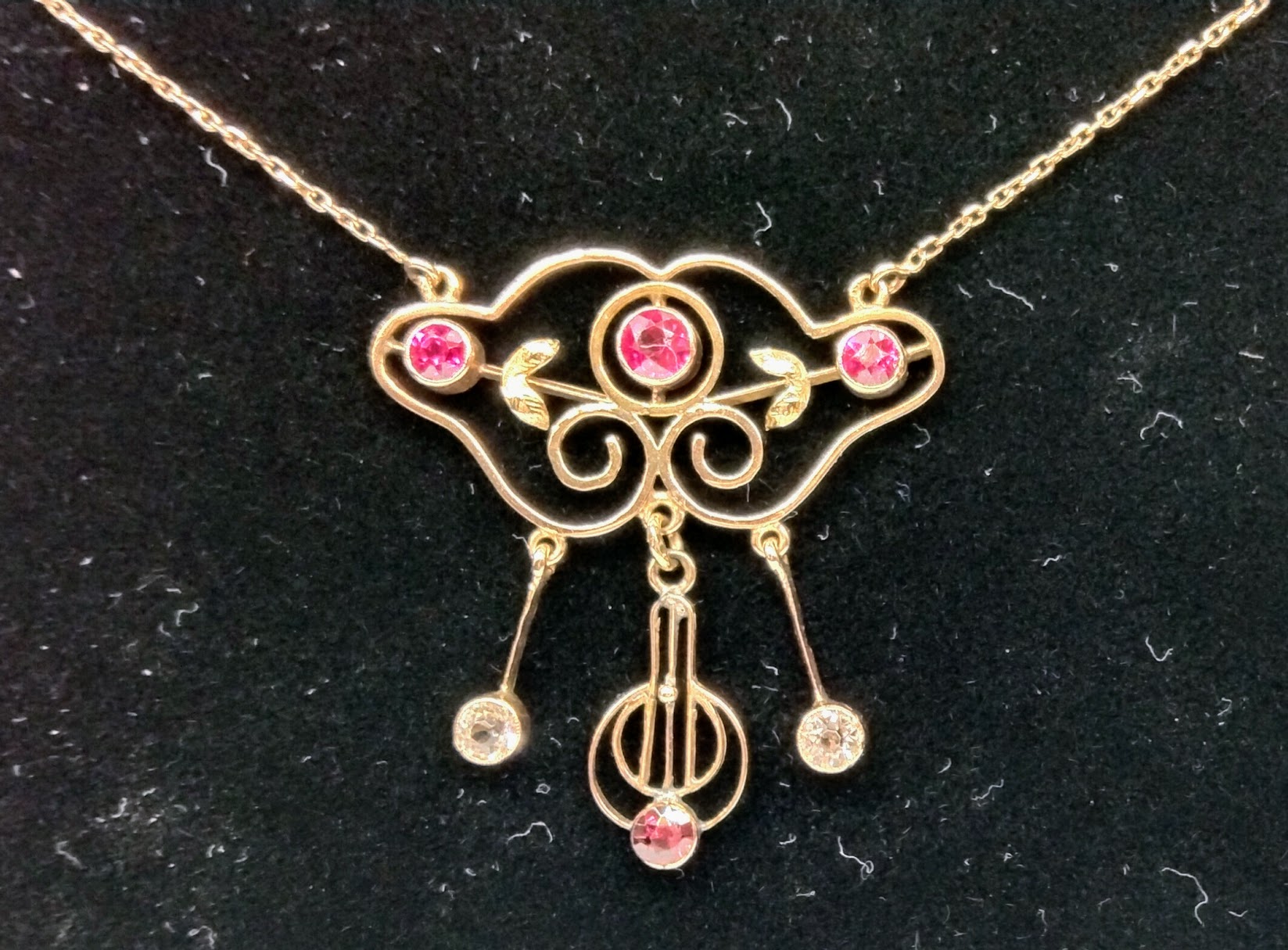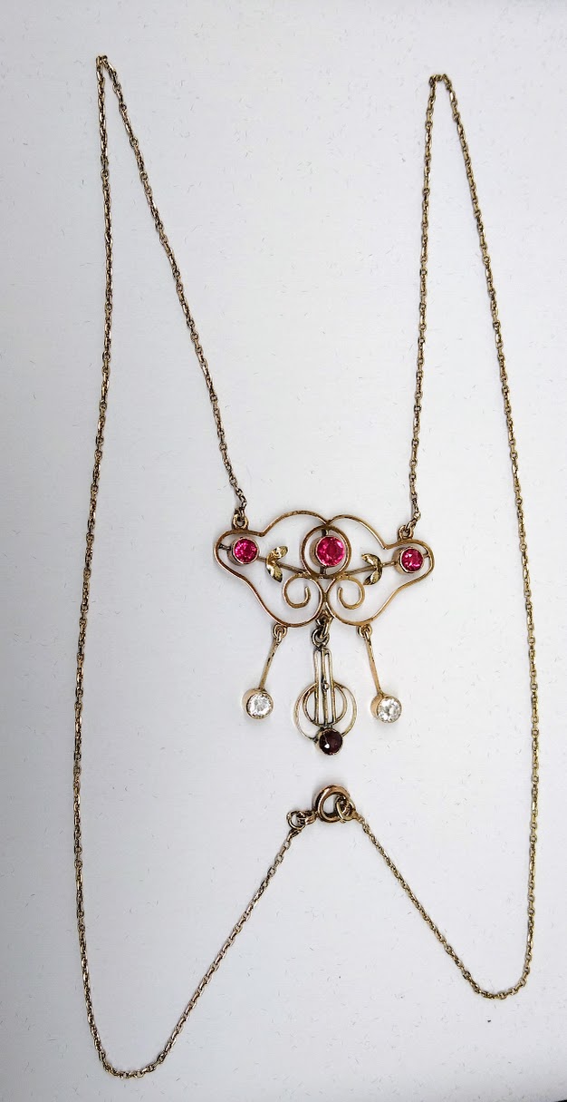Zlatý postsecesní náhrdelník se syntetickými rubíny a leukosafíry. Celková hmotnost 4,99 g, Au 585/1000, punc lvíček (Z – 45). Špičková šperkařská práce, Republika Československá, druhá čtvrtina 20. století. Délka závěsu 3,5 cm, šířka 3,3 cm, délka řetízku 49 cm.