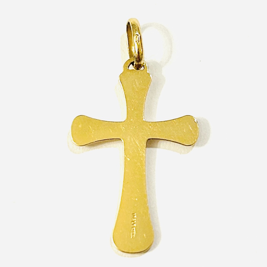 Větší přívěšek ve tvaru latinského kříže s rozšiřujícími se rameny, přední strana s efektními plastickými liniemi. Kvalitní italská zlatnická práce z přelomu 20. a 21. století.